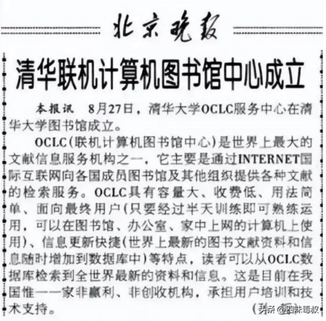 1996年8月27日,清华大学正式成立联机计算机图书馆中心,清华师生可以在此通过登录联网搜寻全世界最新的资料和信息。