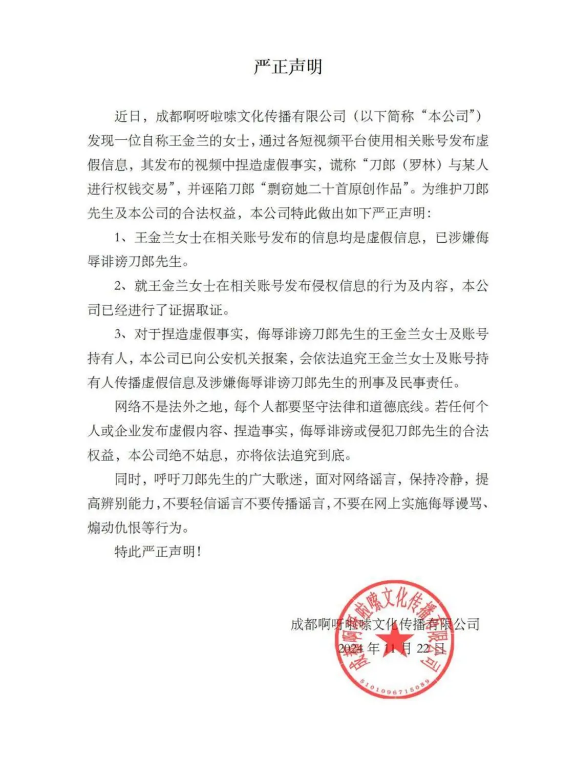 在声明中指出王金兰女士发布的视频中,“刀郎(罗林)与某人进行权钱交易”,“刀郎剽窃她二十首原创作品”等内容均是虚假信息,已涉嫌侮辱诽谤刀郎先生,公司已经进行了证据取证,并且已向公安机关报案!