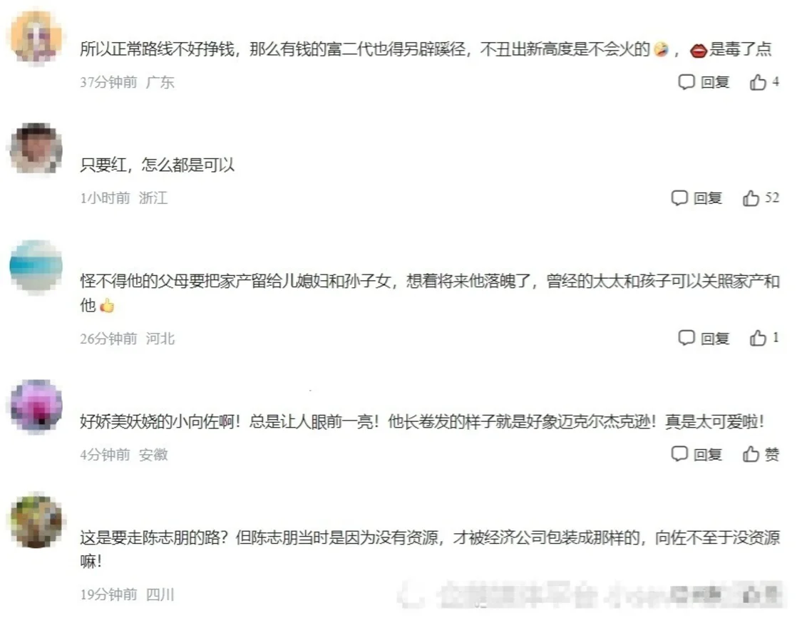 大妈式卷发,小吊带,妖娆的姿势和妆容,关于向佐消息的评论区瞬间沦陷。网友都忍不住问一句,向佐是不是不想当郭碧婷丈夫了,想和郭碧婷当姐妹了?更多的网友则是觉得向佐为了红另辟蹊径,只是这样的做法部分网友实在难以接受。