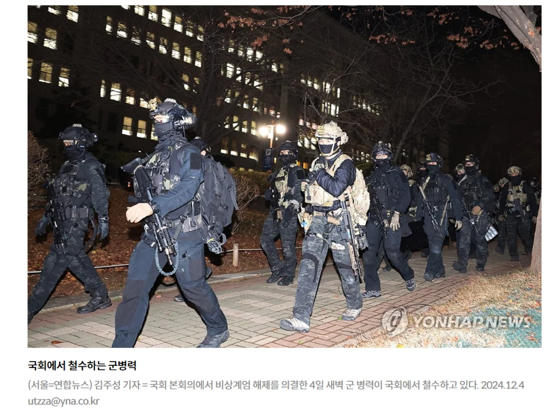据韩国国会4日通报,在总统尹锡悦宣布紧急戒严令之后,有280余名戒严军进入国会。4日凌晨,韩国会投票通过“解除戒严”决议后,戒严部队撤出国会。