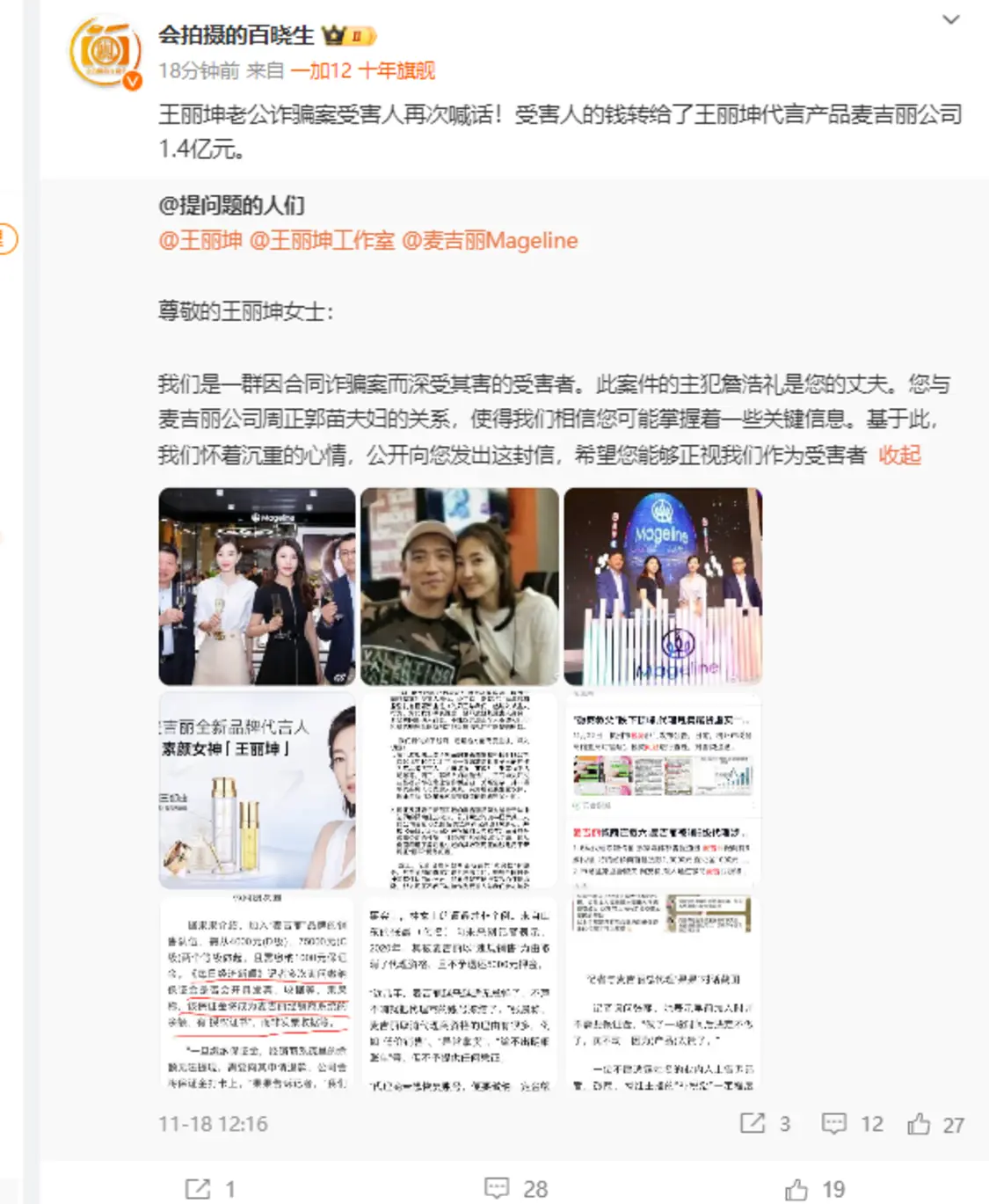 王丽坤老公诈骗案受害人再次喊话!受害人的钱转给了王丽坤代言产品麦吉丽公司1.4亿元。