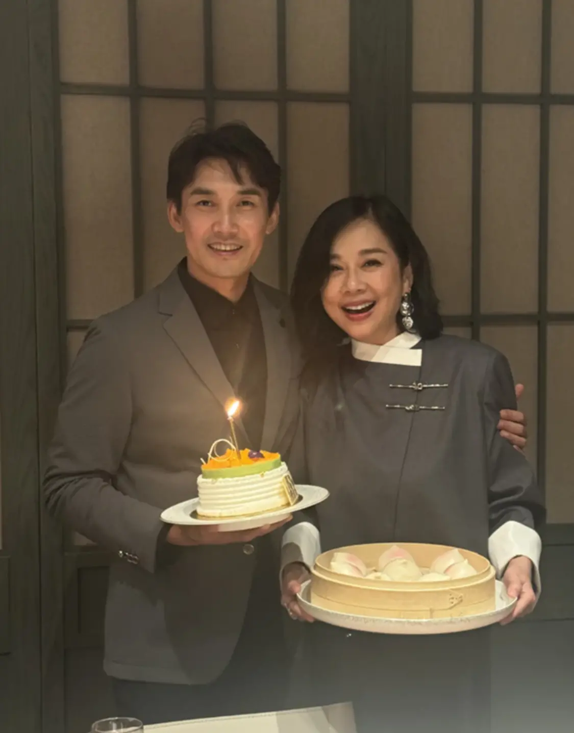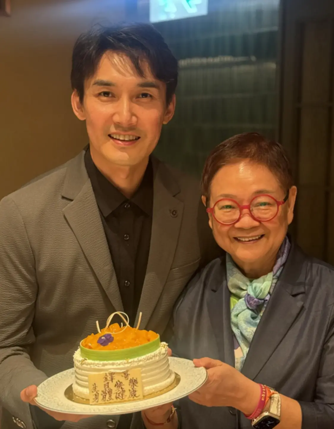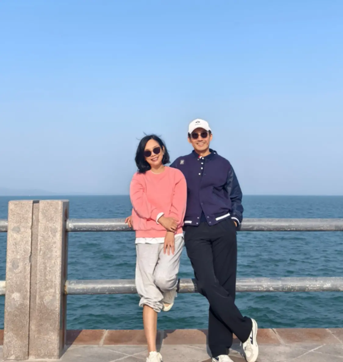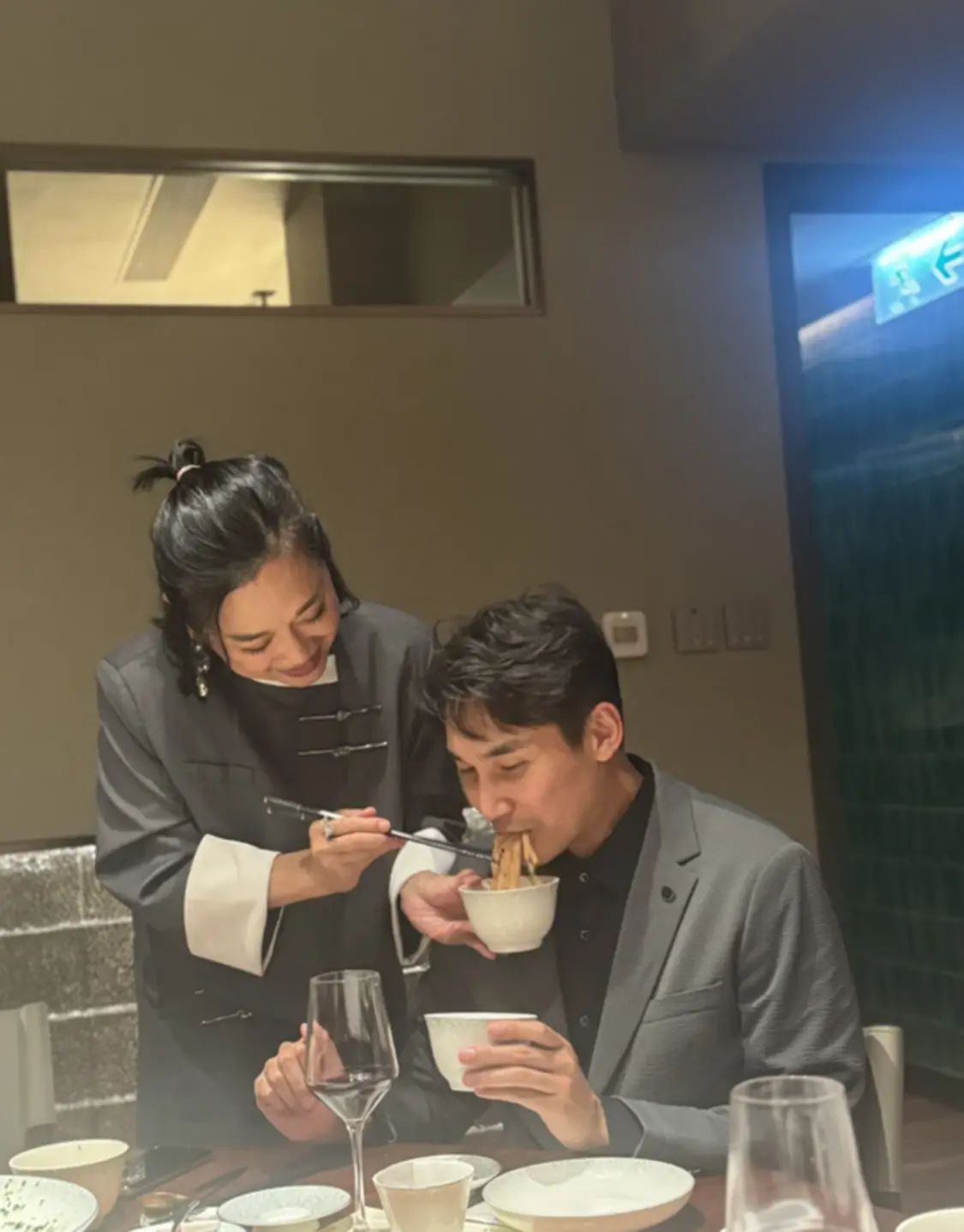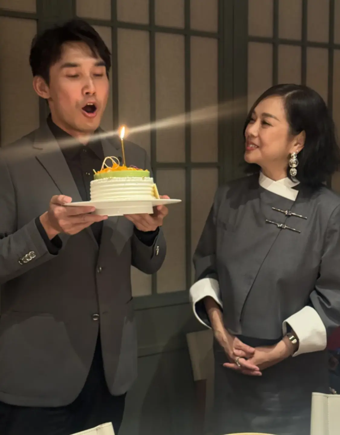 照片中,迎来45岁生日的张铎身穿黑色衬衣灰色西装套装,身姿笔挺,完全没有中年男人的发福痕迹。陈松伶和老公穿着同色外套,像是情侣款。