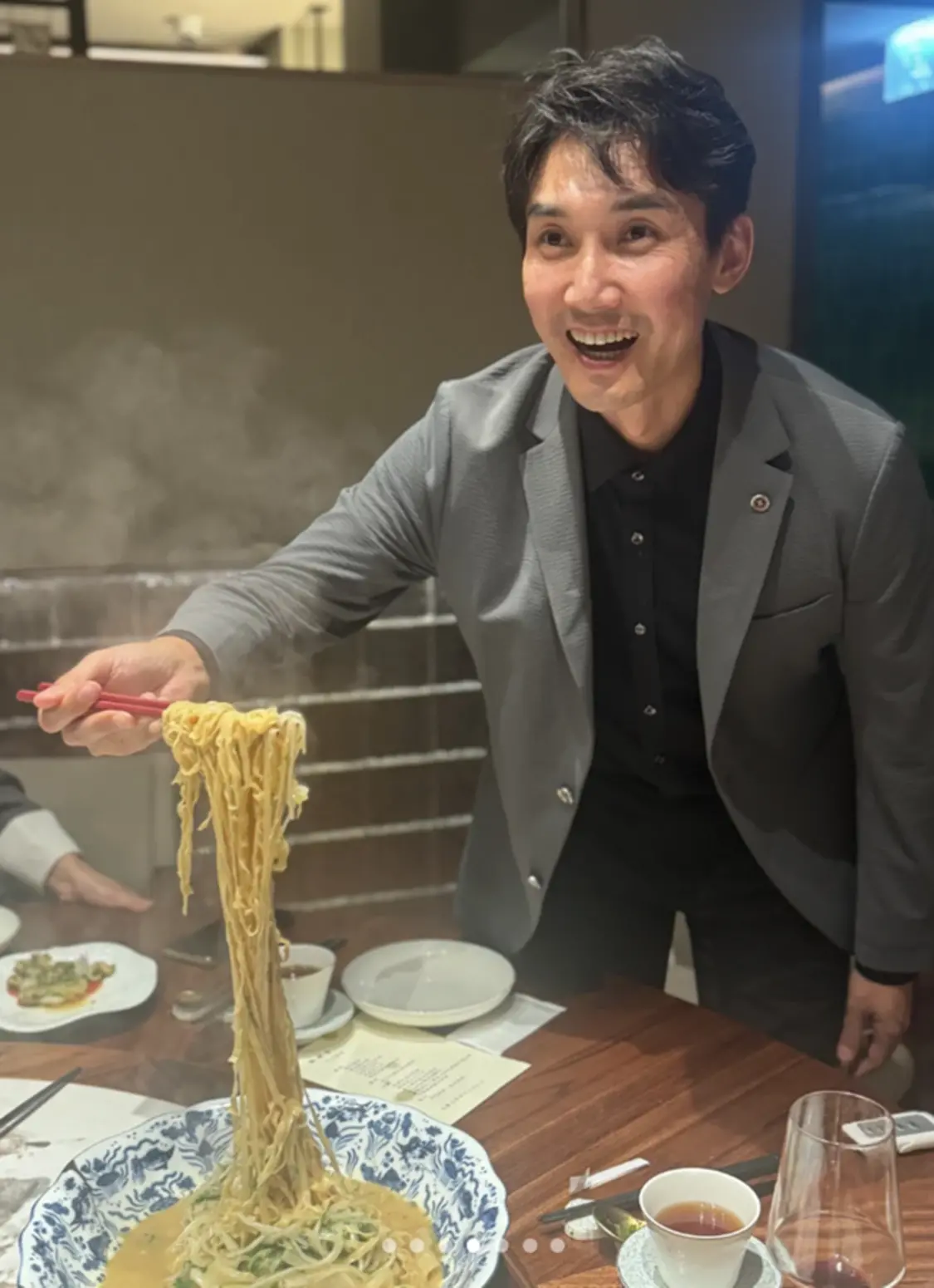 有老婆友人陪伴庆生的张铎,别提多开心了。下图中,笑容满面吃寿面的张铎,笑得眼角皱纹都出来了。