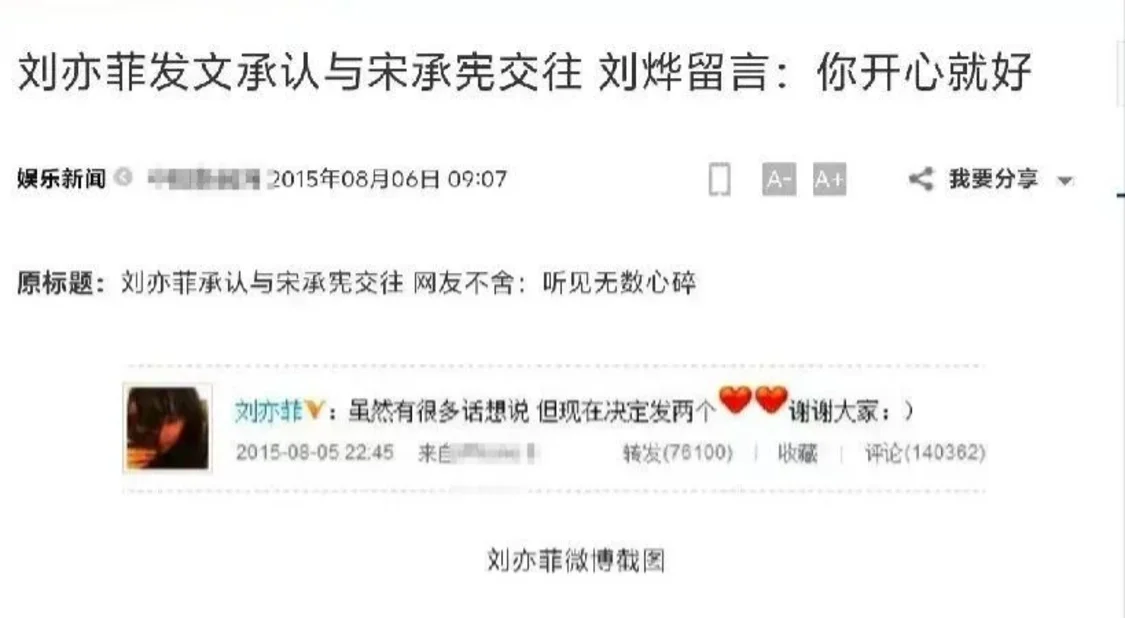 我记忆里不是绯闻说他俩可能在一起了。而是放出消息说刘亦菲和宋在谈,类似于公布,不是疑似。但是后续就没任何消息了,按说天仙第一次恋爱新闻,应该会引发关注的。但是后续啥也没有,没有后续合体的照片,没有消息,也没有任何对这段恋爱关系的访问。后面就说分手了,真的啥也没有,感觉是假恋爱一样。