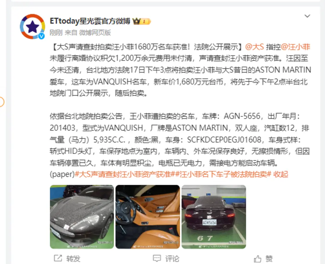10月17日,据台媒报道,大S指控汪小菲未履行离婚协议积欠1,200万余元费用未付清,声请查封汪小菲资产获准。汪因至今未还清,台北地方法院17日下午3点将拍卖汪小菲与大S昔日的ASTON MARTIN爱车,这车为VANQUISH名车,新车价1,680万元台币,将先于今下午2点半台北地院门口公开展示,随后拍卖。