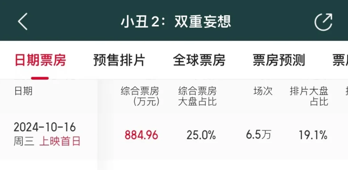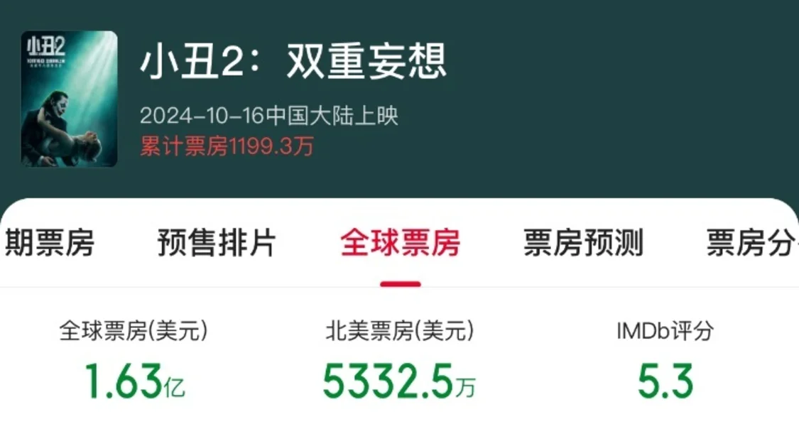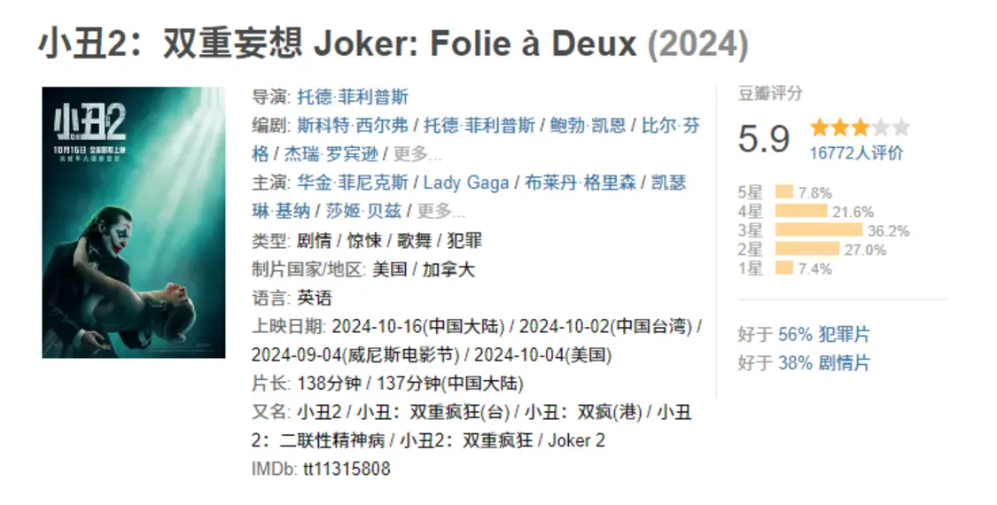 在北美公映12天后,由杰昆·菲尼克斯、Lady Gaga主演的《小丑2:双重妄想》在内地上映了。据统计,影片首日票房885万,豆瓣评分5.9分,未能及格。这样的票房成绩和评分,也延续了北美的颓势。