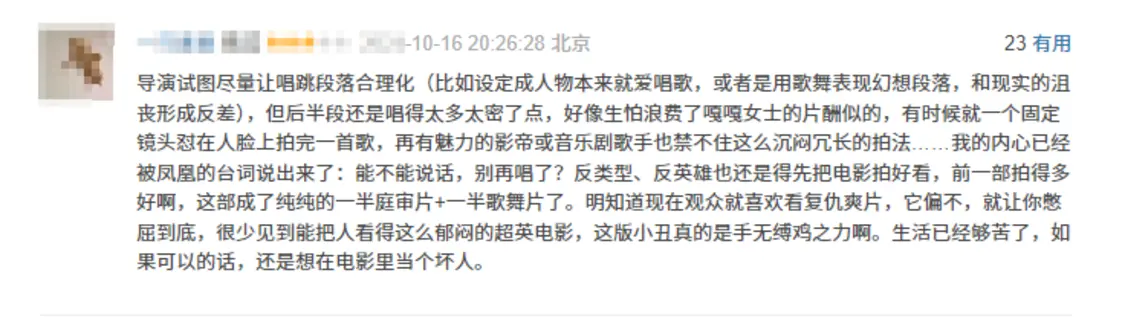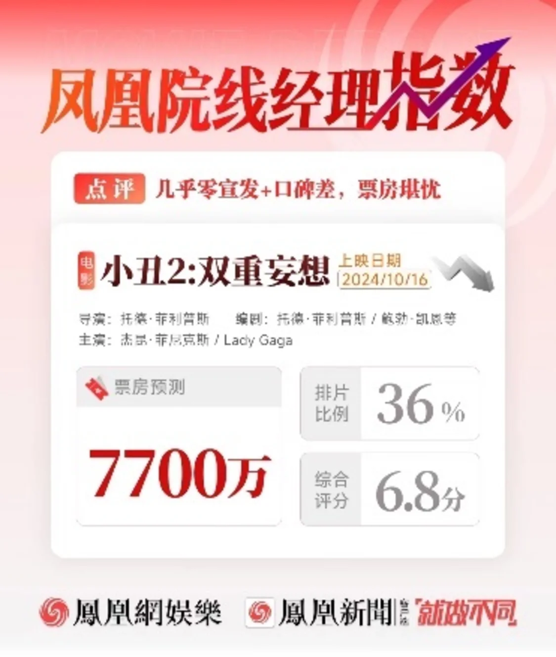 对比前作,《小丑》当年以5500美元的低制作成本,收获了10亿美元的票房。据Forbes报道,《小丑》是有统计以来成本最低的10亿美元电影,后更是被烙印上“最赚钱漫改电影”的名号。作为续集,《小丑2》为何会如此失败?有票房分析师认为,续集中加入的歌舞表演,疏远了DC影迷群体,有一些歌曲场面,就显得有些过于刻意,甚至有些尴尬,这一点也是许多观众观看后吐槽的点,甚至有网友评该片是“哥谭变歌坛”。