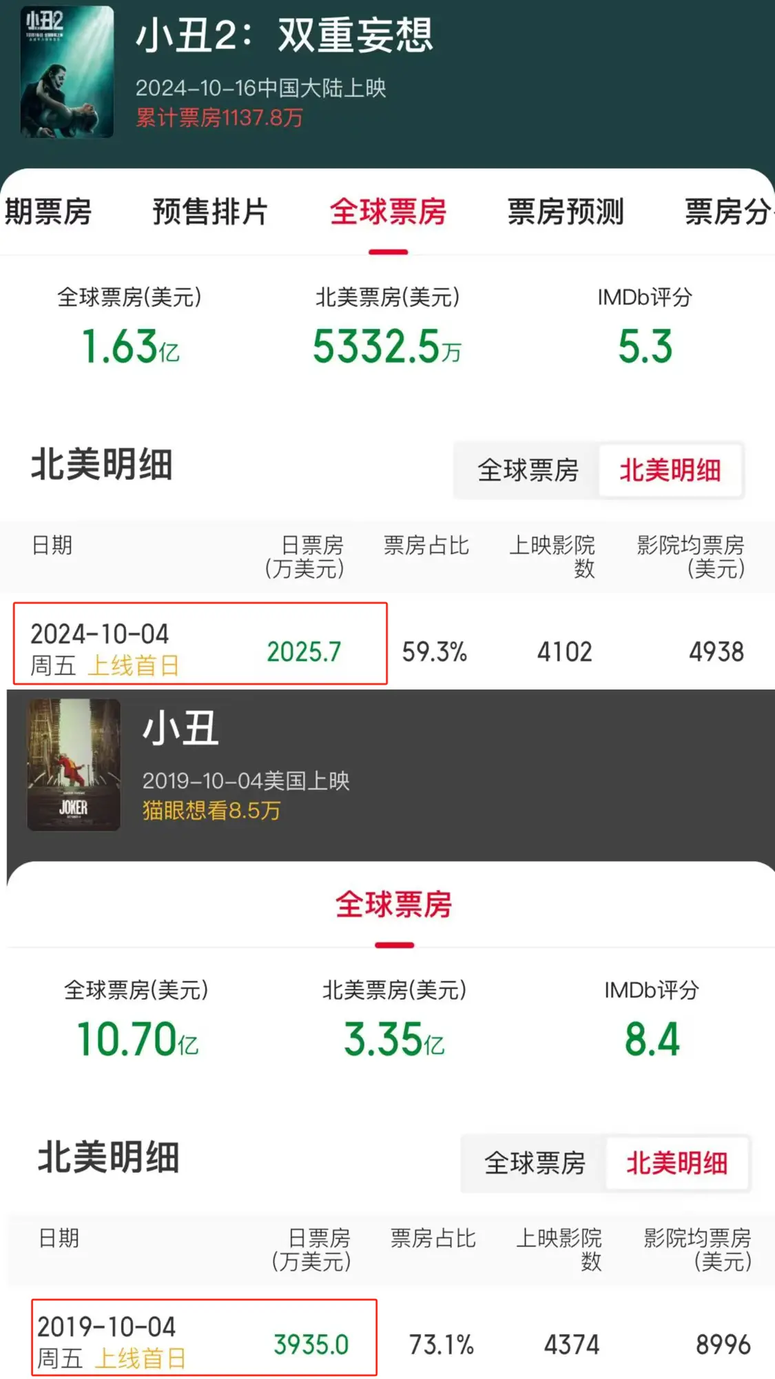 作为备受影迷期待的DC大片《小丑2》自10月4日登陆北美院线以来,不仅差评如潮,票房更是凄惨。影片在北美上映首日仅收获了2000万美元票房,和第一部相比下降了近50%。在上映第二周更是票房大跳水,次周末票房仅706万美元,较首周末的3780万美元暴跌81%。该成绩刷新了漫画超级英雄IP电影北美首/次周末跌幅新高,同时也创下北美高预算电影历史最大的次周末跌幅。