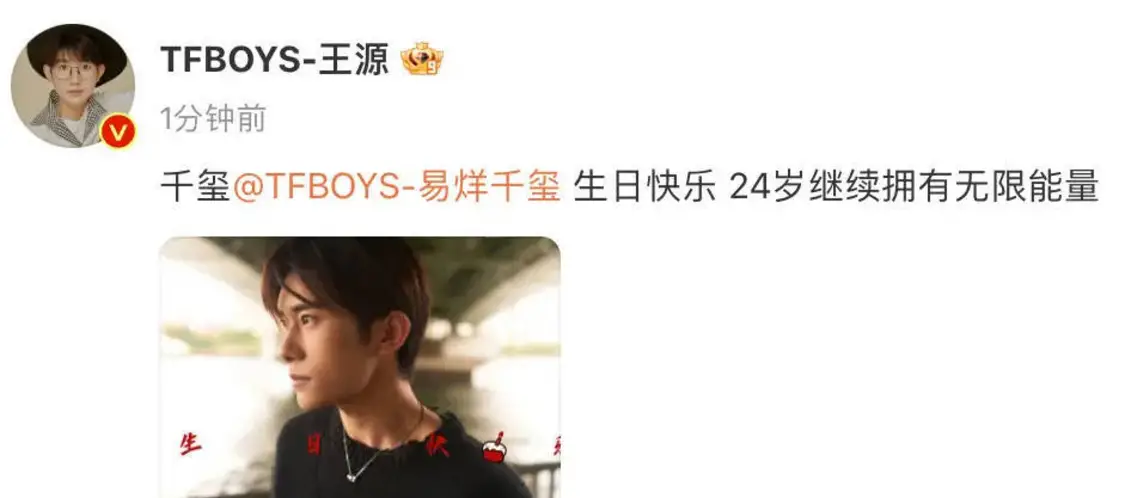 11月28日,TFBOYS成员王俊凯和王源卡零点发文,为易烊千玺庆祝24岁生日。王俊凯祝福道:“兄弟,24岁生日快乐,新的一岁所得皆所愿,天天开心!”王源也送上祝福:“千玺,生日快乐,24岁继续拥有无限能量。”