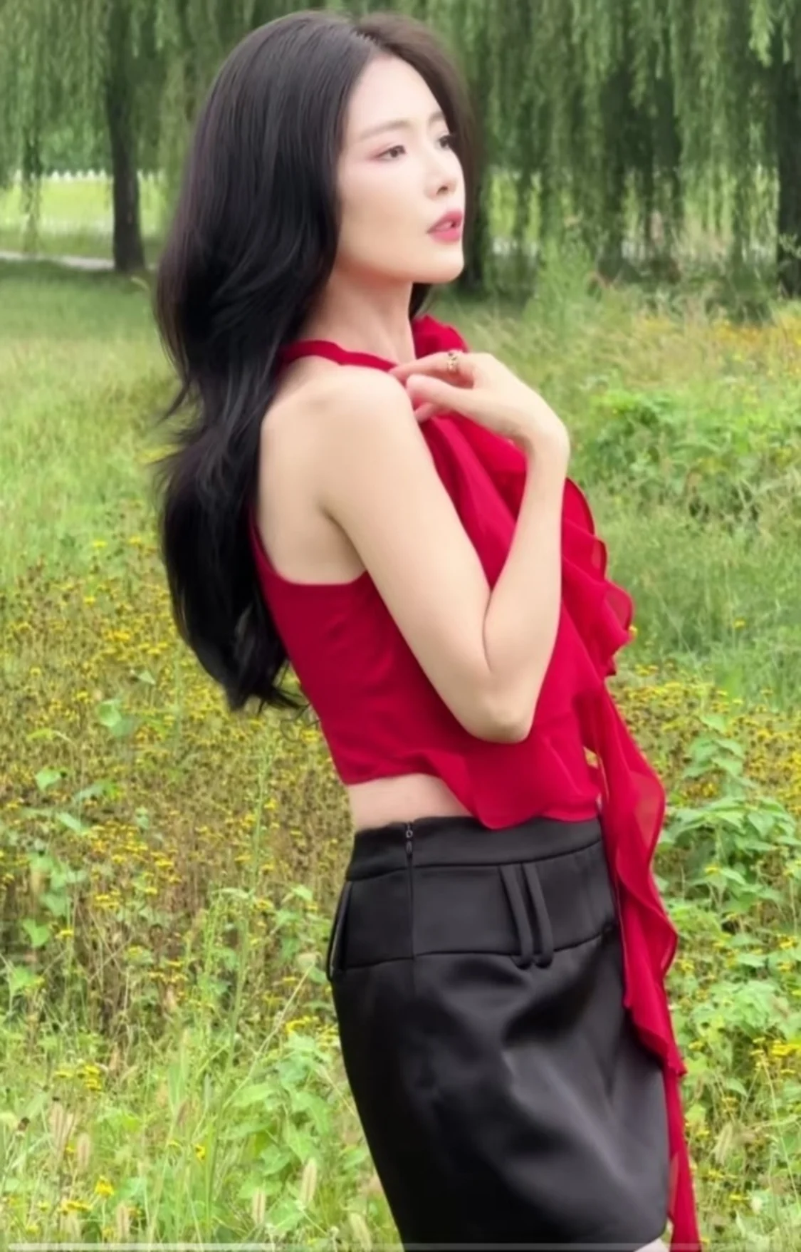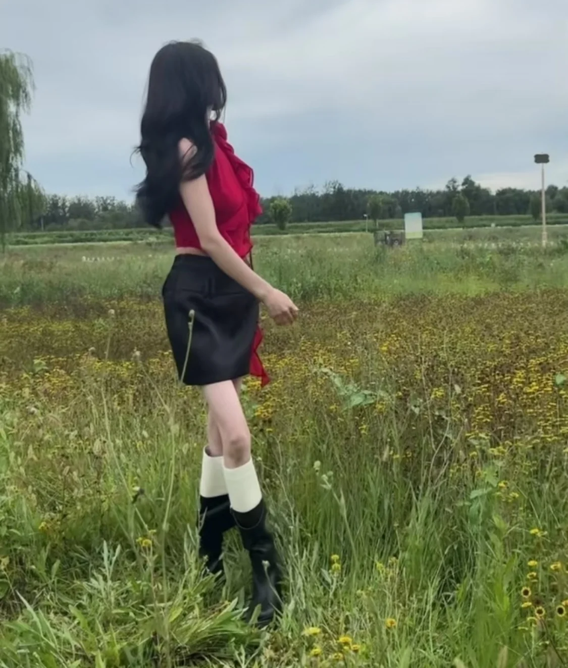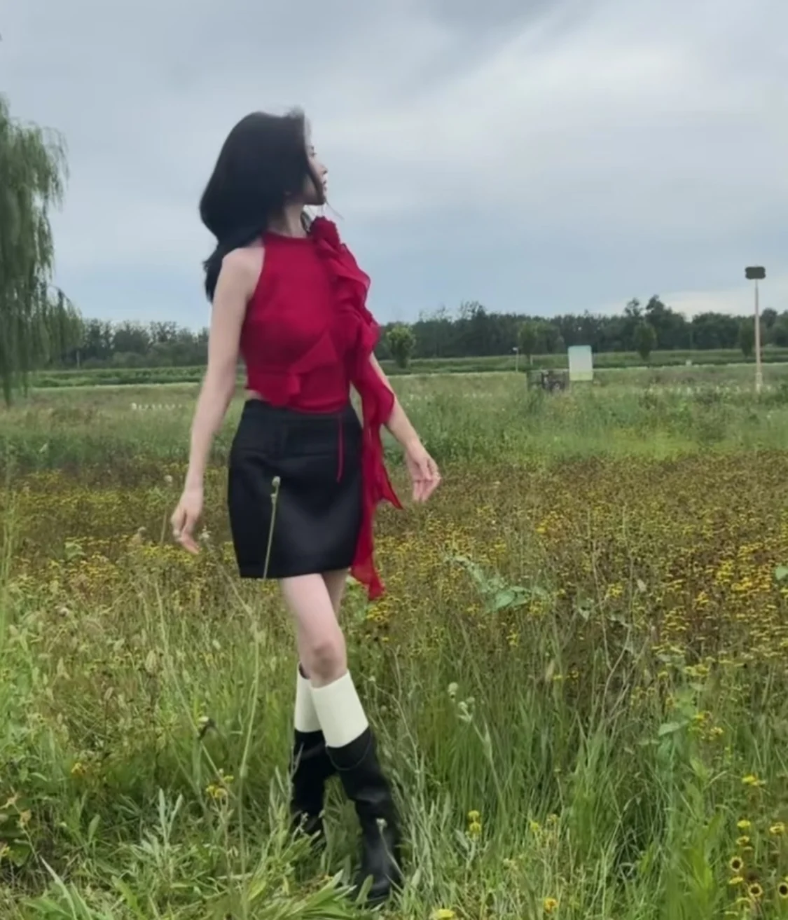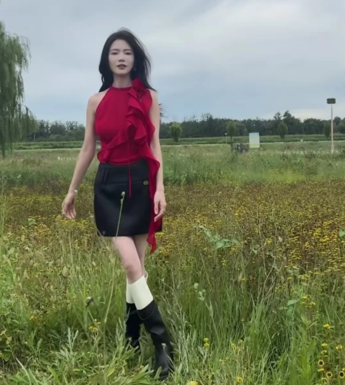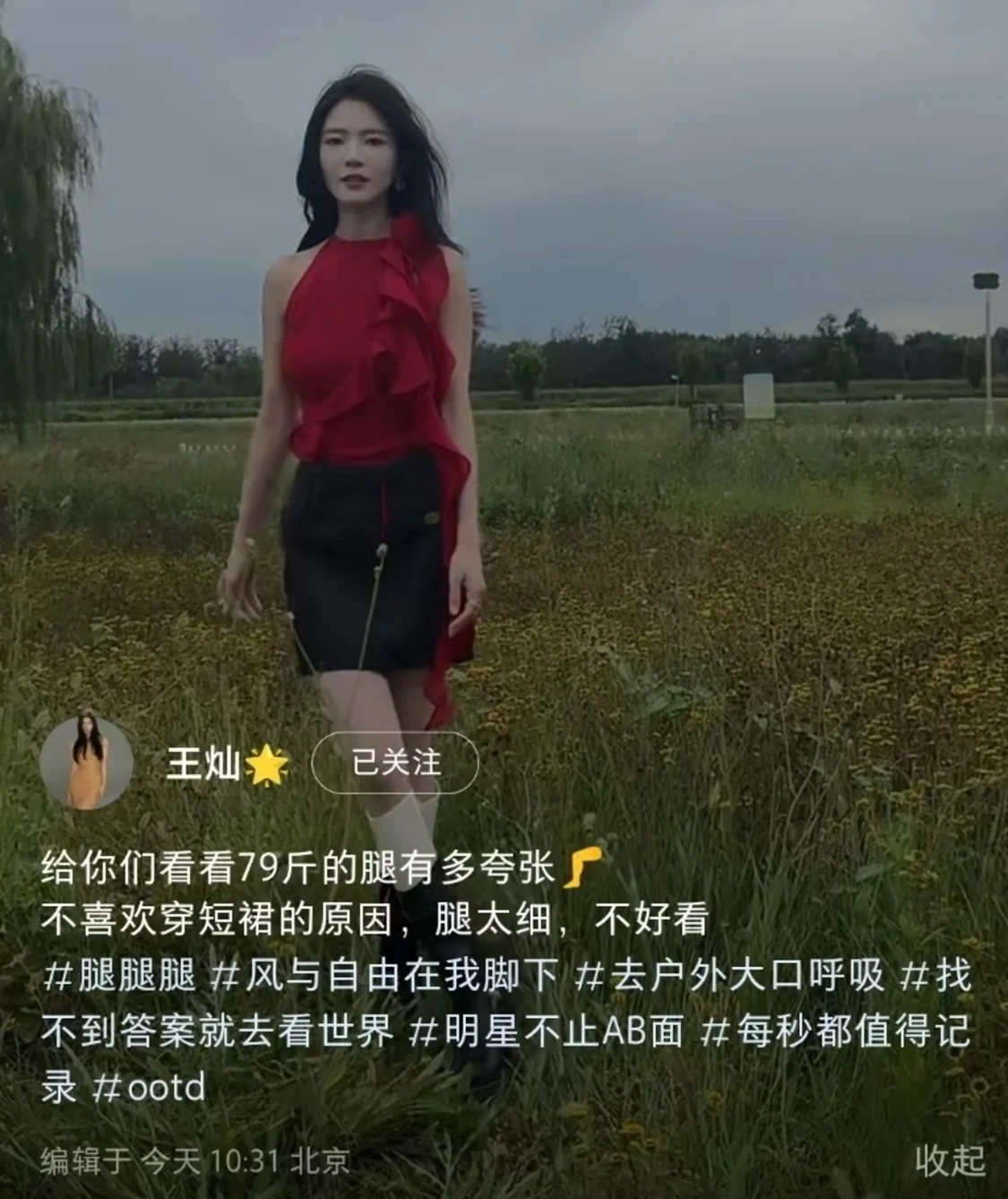 晒出的画面里,王灿披着长发,化着红唇美妆,身穿大红色无袖上衣搭配黑色超短裙,脚踩长靴,整体look充满御姐范儿。王灿的美毋庸置疑,颜值气质完全不输娱乐圈里的女明星,超级养眼。但她看上去真的太瘦啦,不仅没有赘肉,长腿还细得过分。