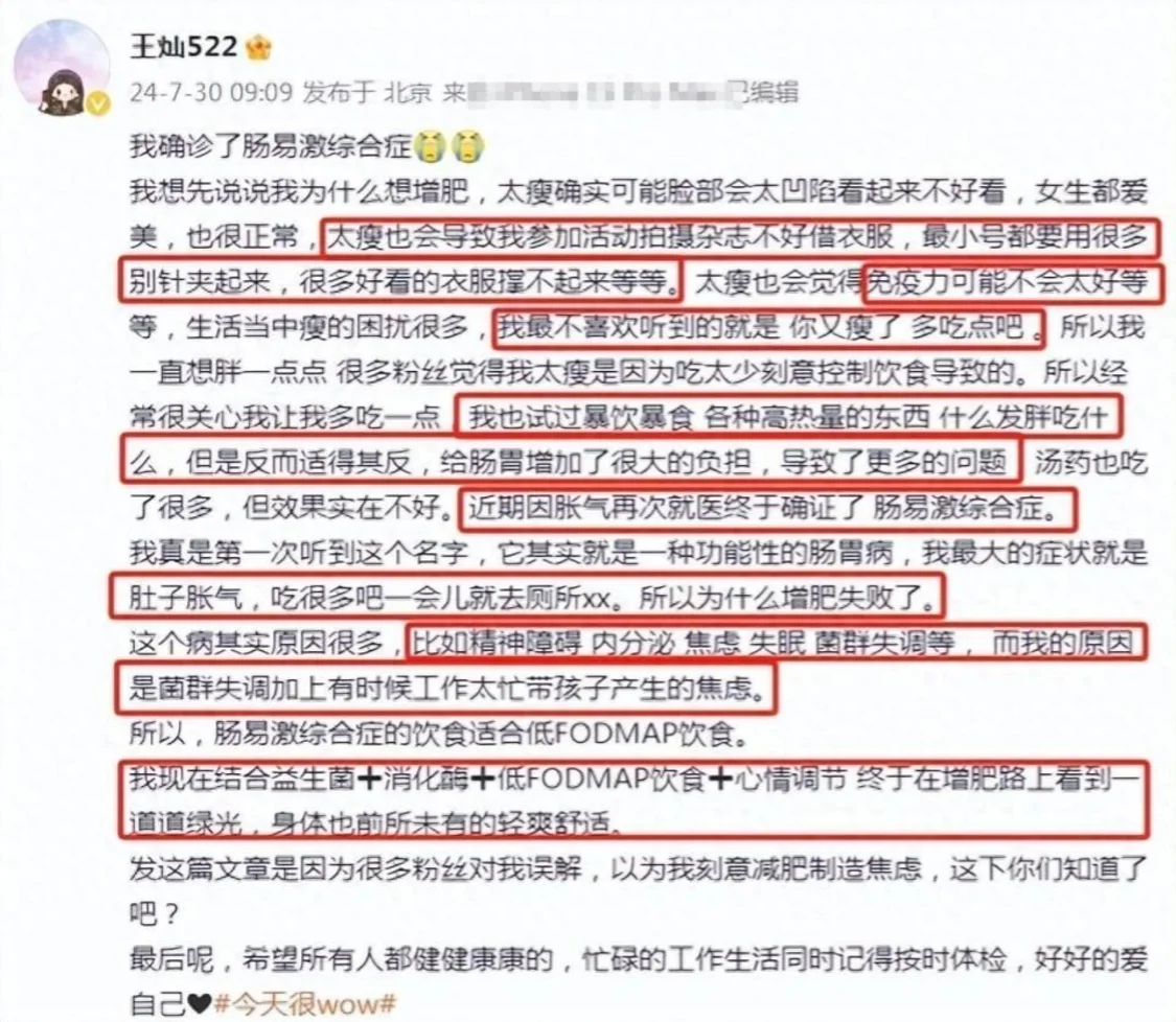 对于自己的暴瘦,王灿不止一次在网上发文寻找增肥方法,她甚至为了长胖中西医以及偏方都找过了,但效果都不怎么样。直到今年7月30日,王灿才在社交账号上发文透露自己患上了“肠易激综合症”,原来她一直暴瘦就是因为患上了这种病症。