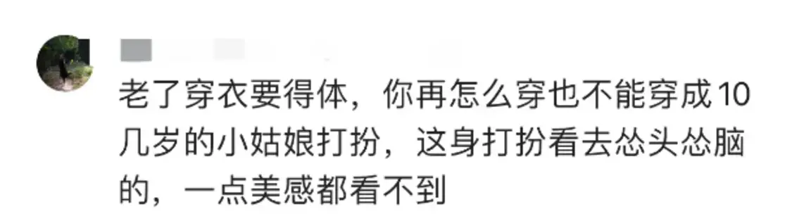 “都已经58岁了,就不要再强行扮嫩了,还不如收拾的体面一点,这样或许还会让大家更加的喜欢,这样的服装给人的感觉就是怂头怂脑,完全看不到任何一点美感”。