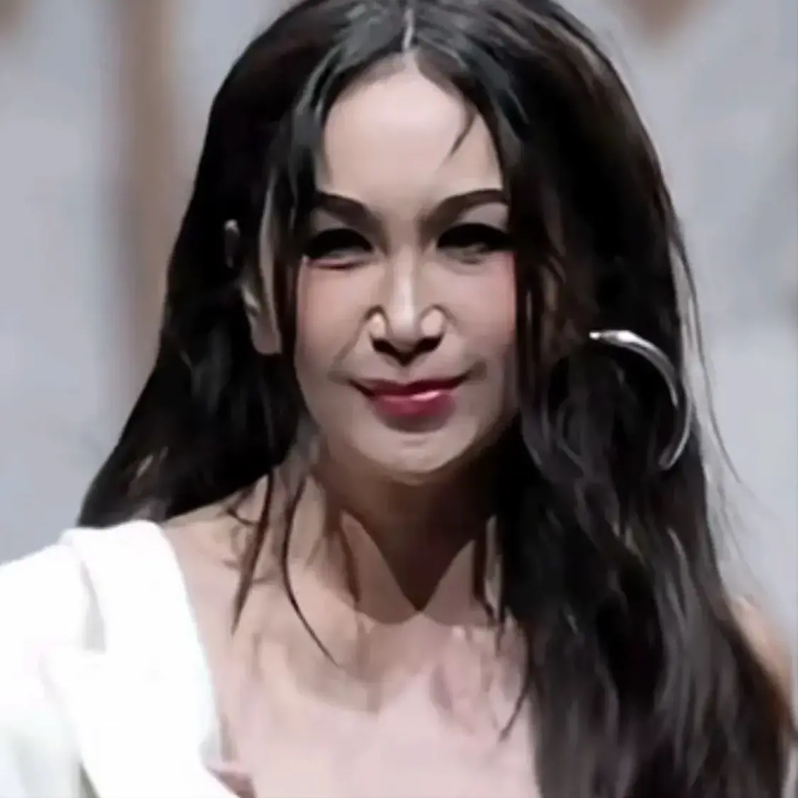 这些年她给人的感觉就是很落魄,每次出现在镜头面前,一直是披头散发,而且发质也给人一种很不好的感觉,不知道的还以为带了一顶假发在头上。