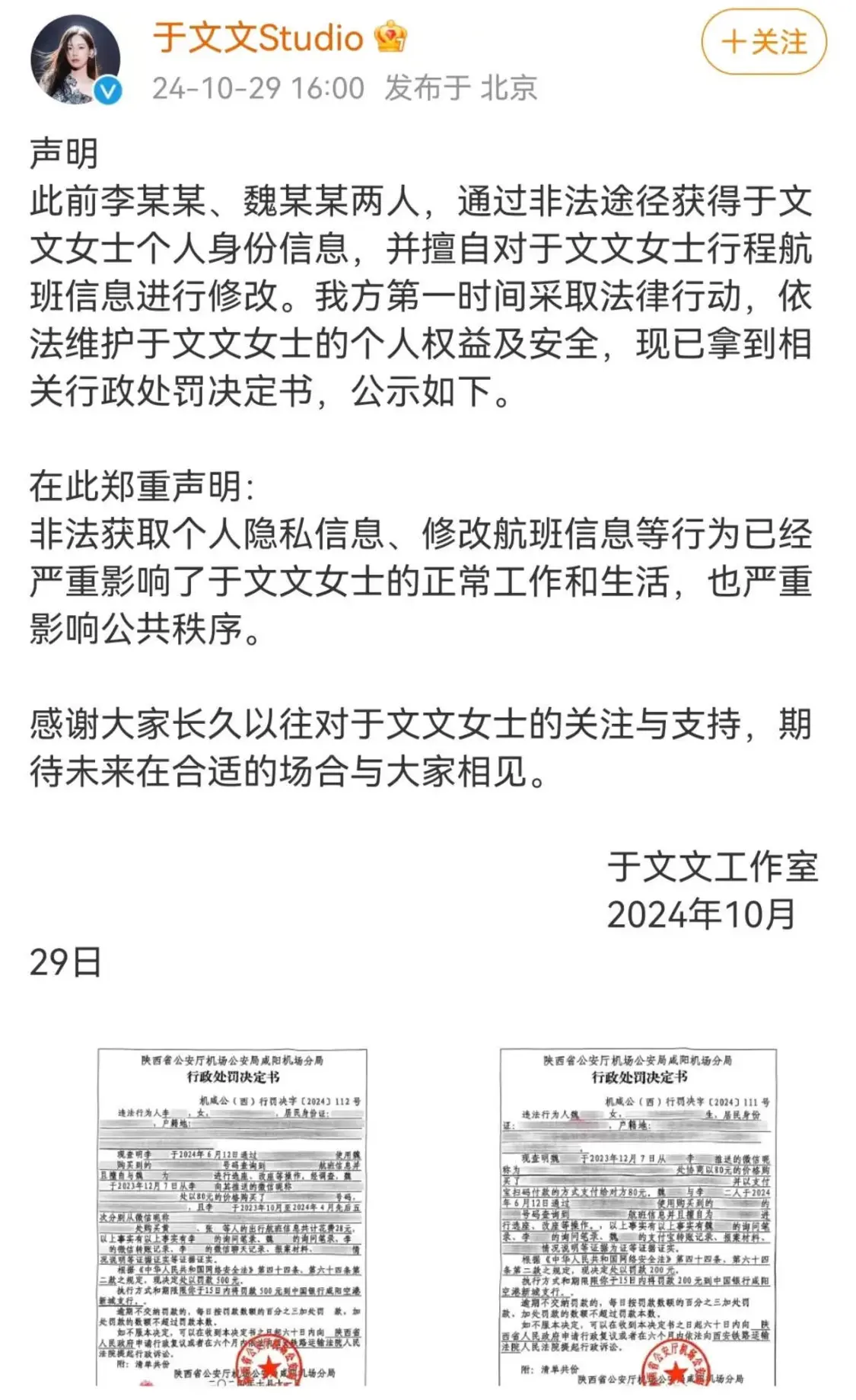 于文文工作室在微博中称,“非法获取个人隐私信息、修改航班信息等行为已经严重影响了于文文女士的正常工作和生活,也严重影响公共秩序。”在得知个人信息泄露以后,“我方第一时间采取法律行动,依法维护于文文女士的个人权益及安全。”