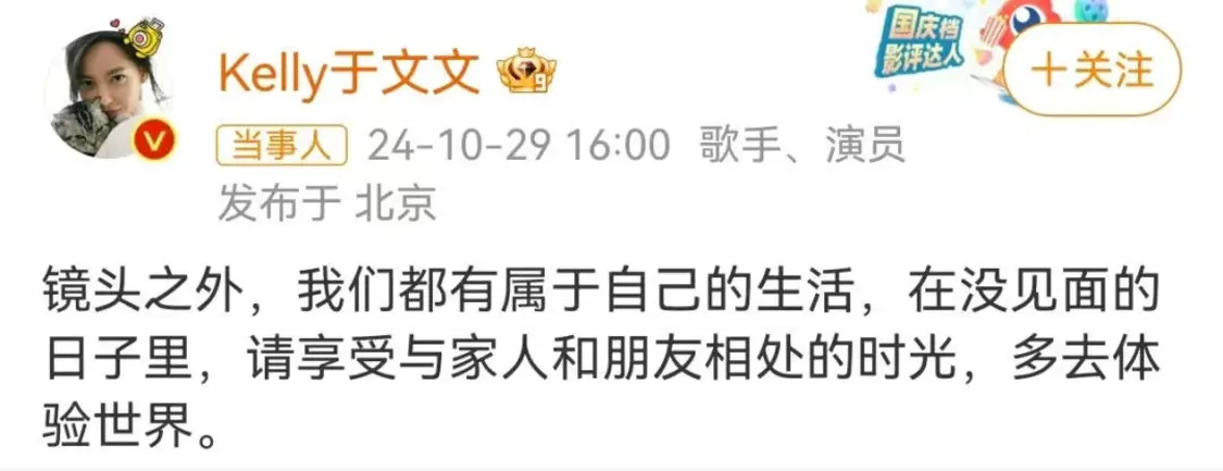 而于文文本人随后也发布微博称:镜头之外,我们都有属于自己的生活,在没见面的日子里,请享受与家人和朋友相处的时光,多去体验世界。