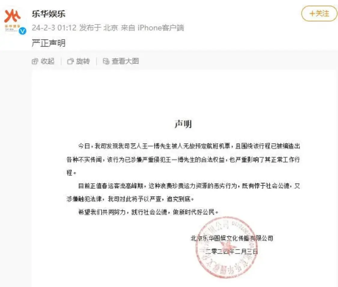 当时,王一博经纪公司乐华娱乐,在社交平台发布严正声明称,王一博被人无故预订机票并围绕该行程被编造出不实传闻。