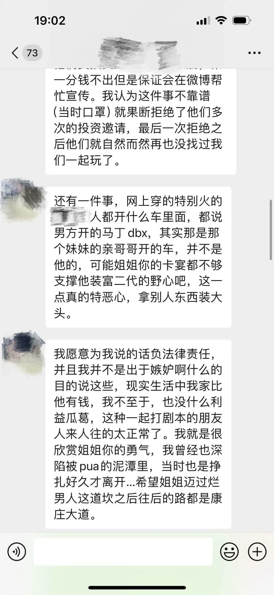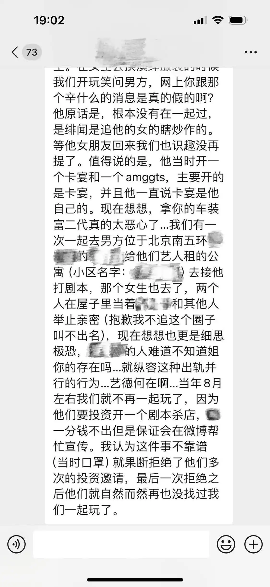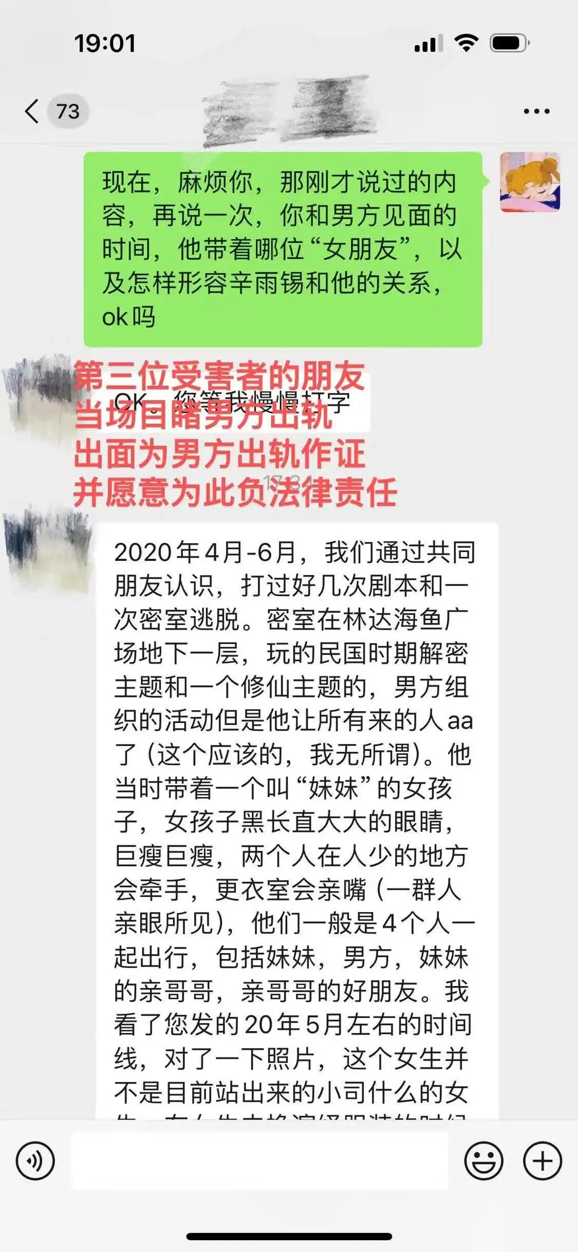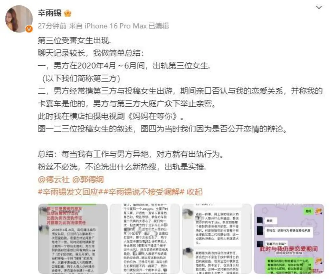 9月28日,辛雨锡曝秦霄贤出轨的第三位受害女生,她发文称:“男方在2020年4月~6月间,出轨第三位女生(简称第三方)。男方经常携第三方与投稿女生出游,期间亲口否认与我的恋爱关系,并称我的卡宴车是他的,男方与第三方大庭广众下举止亲密。”并表示:“每当我有工作与男方异地,对方就有出轨行为。”