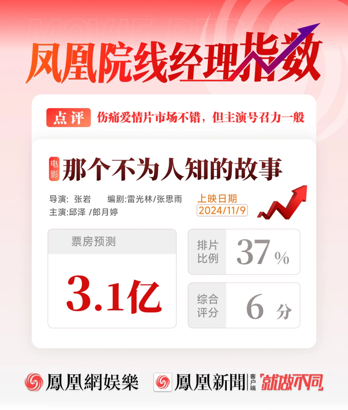 11月9日,改编自晋江文学城同名小说的电影《那个不为人知的故事》将上映,该部影片由邱泽、郎月婷担任主演。凤凰网娱乐“凤凰院线经理指数”集结全国多位一线电影院线工作者,对该片进行票房预测。院线经理认为,伤痛爱情片市场不错,但主演号召力一般,会减少一些预测,预测该片票房可达3.1亿,排片比例为37%,综合评分6分。