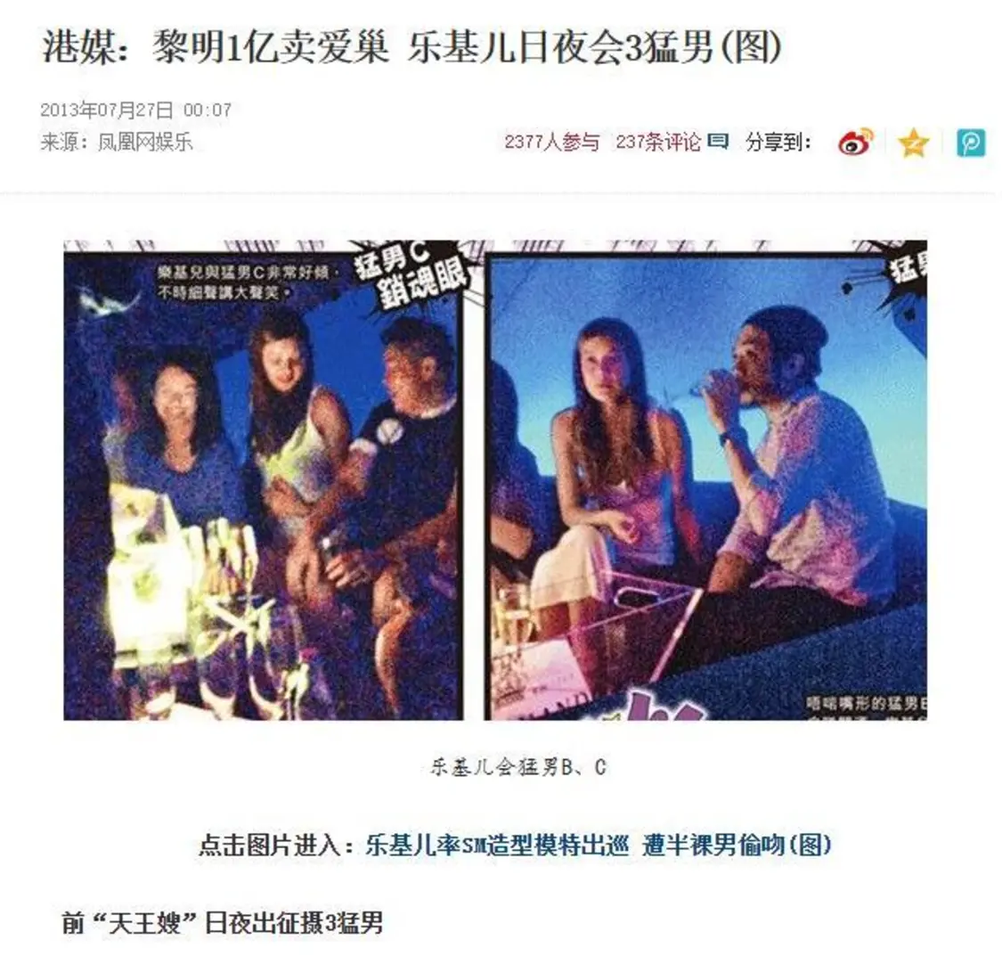 而离婚之后的乐基儿则是更放开了,和各式各样的老外厮混、甚至还被人家发了床照,不少黎明的粉丝都为自己的偶像打抱不平。