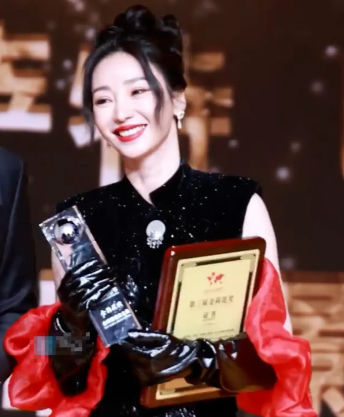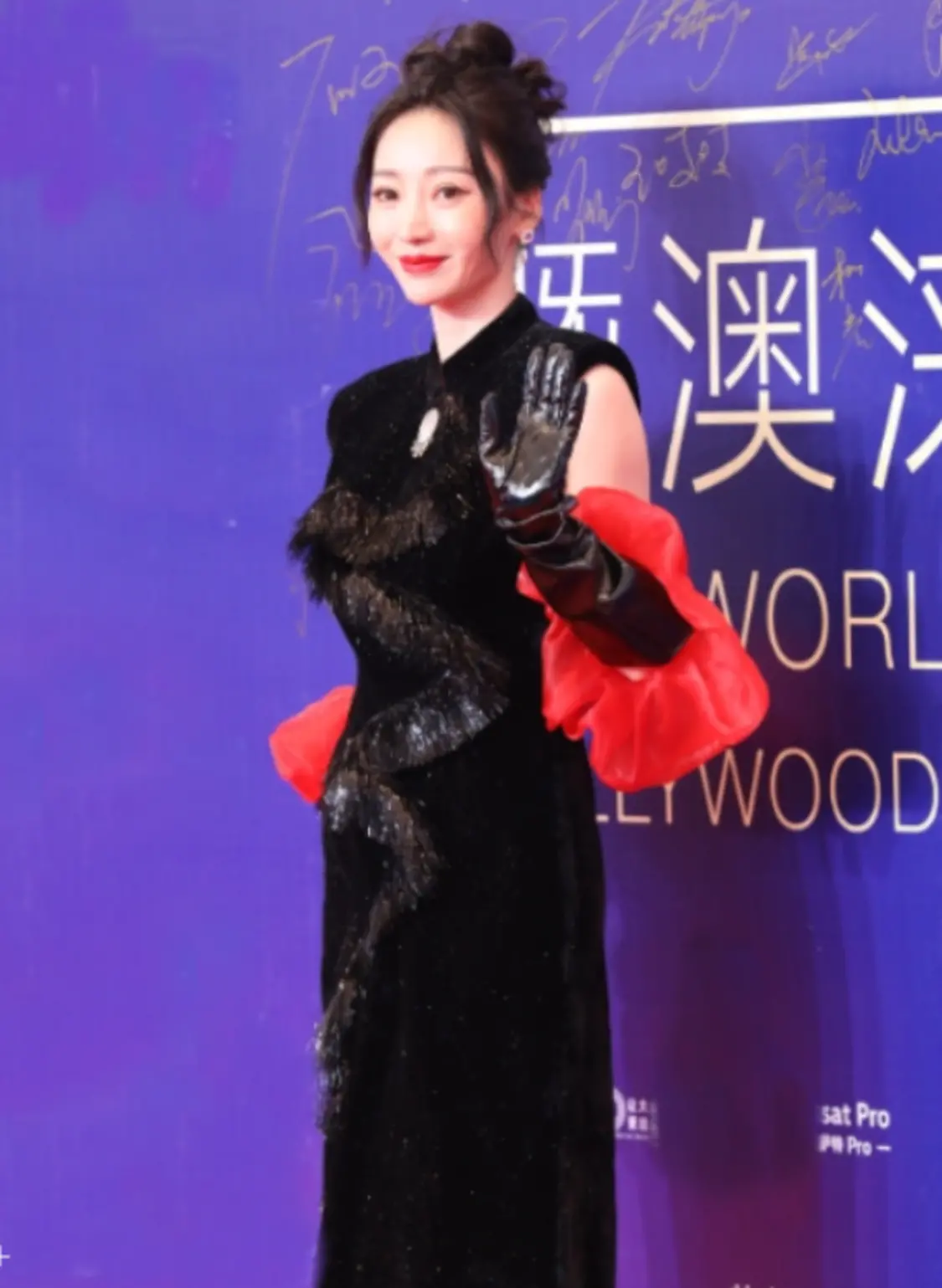 一身黑色新中式礼服,黑色皮手套配上红色丝绸边,高贵优雅又不显沉闷。