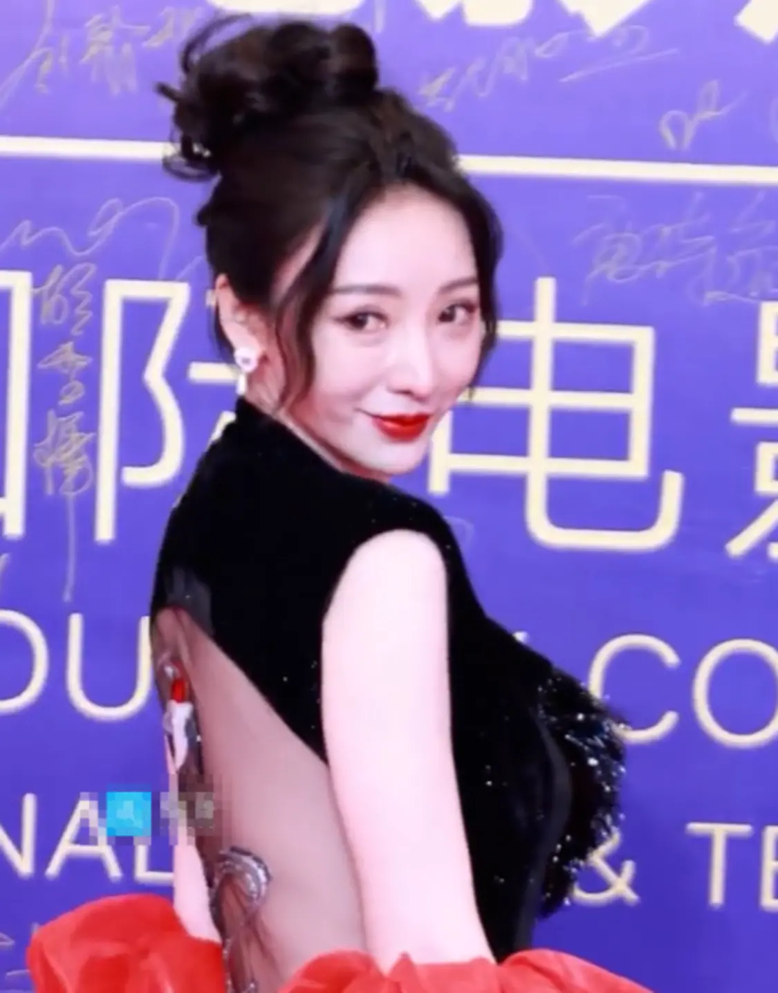高高的花苞丸子头比披肩发利落,造型没有过于精致却也符合场合的格调。