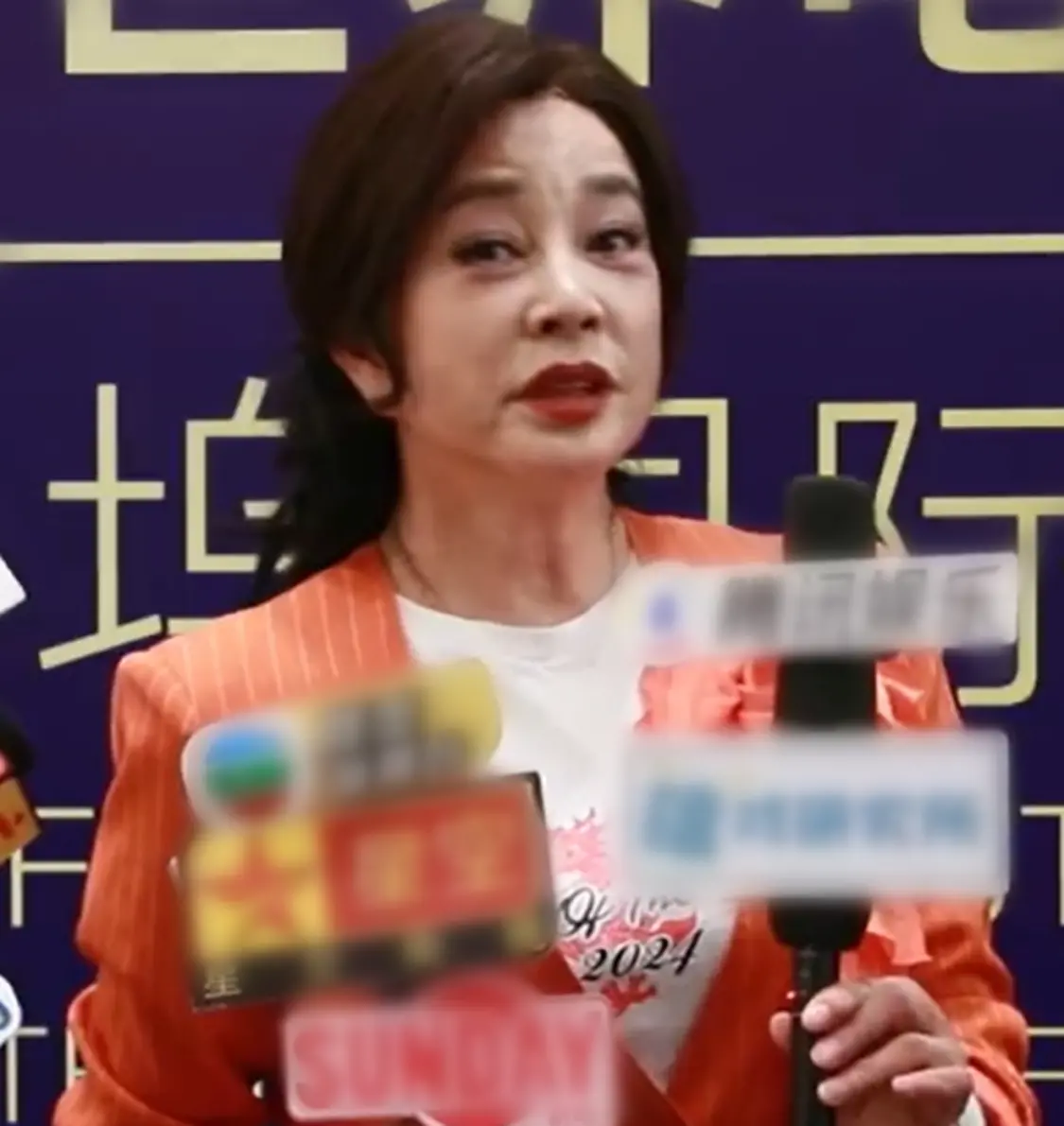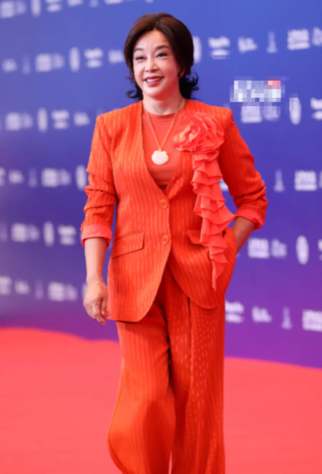这次,她穿了一身鲜红色的西服套装,满面春风面对镜头也笑脸相迎。