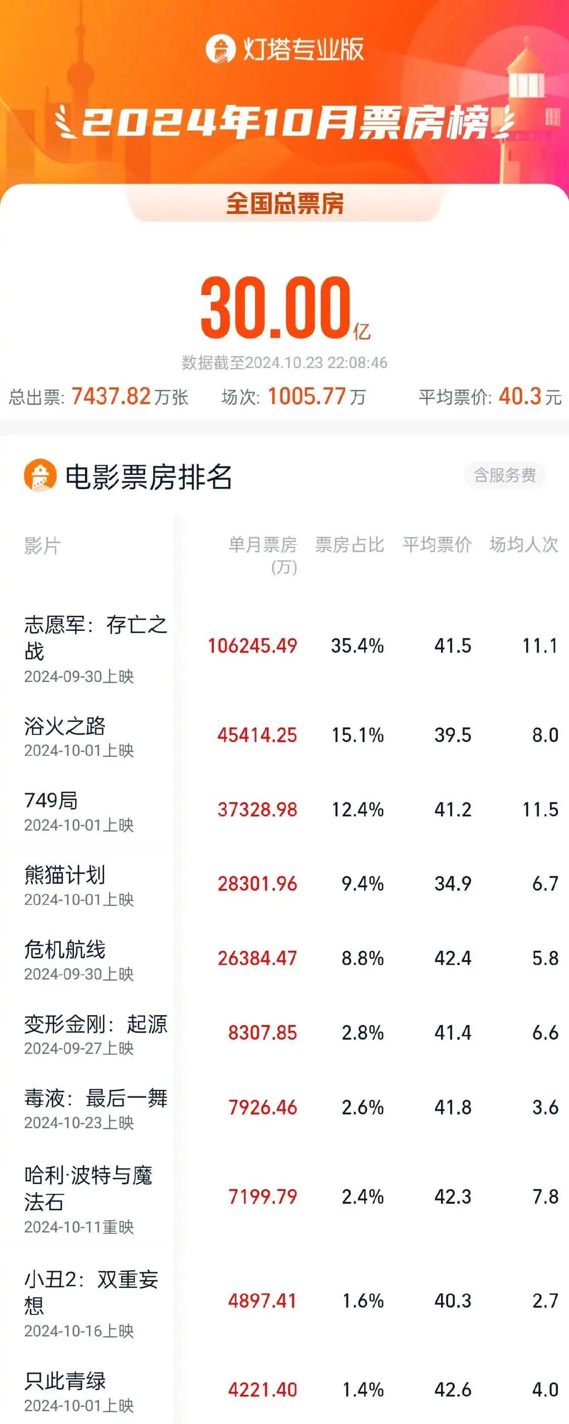 据灯塔专业版,截止10月23日22时08分,2024年10月总票房(含预售)突破30亿。《志愿军:存亡之战》位居第一,票房占比35.4%,《浴火之路》和《749局》位居票房前三位。