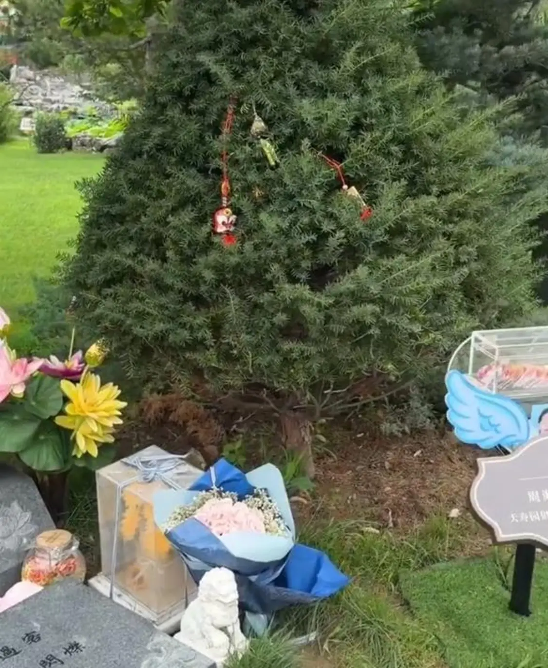 注意看周海媚墓地上面的细节,就连旁边种植的常青树上也挂着粉丝们的缅怀爱心物。