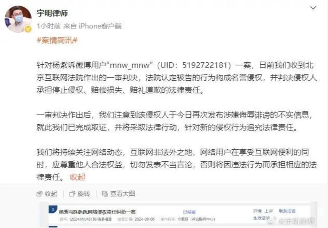 11月13日,一名自称是冯楚轩前女友的微博用户“mnw_mnw”公开发表了一系列关于杨紫与冯楚轩的言论,引发热议。对此,杨紫方律师发文回应,表示此前已经收到该用户侵犯杨紫名誉权的一审判决结果,法院要求其停止侵权、赔偿损失、赔礼道歉。针对该用户今日再次发布涉嫌侮辱诽谤的不实信息,杨紫方已完成取证,并将采取法律行动。