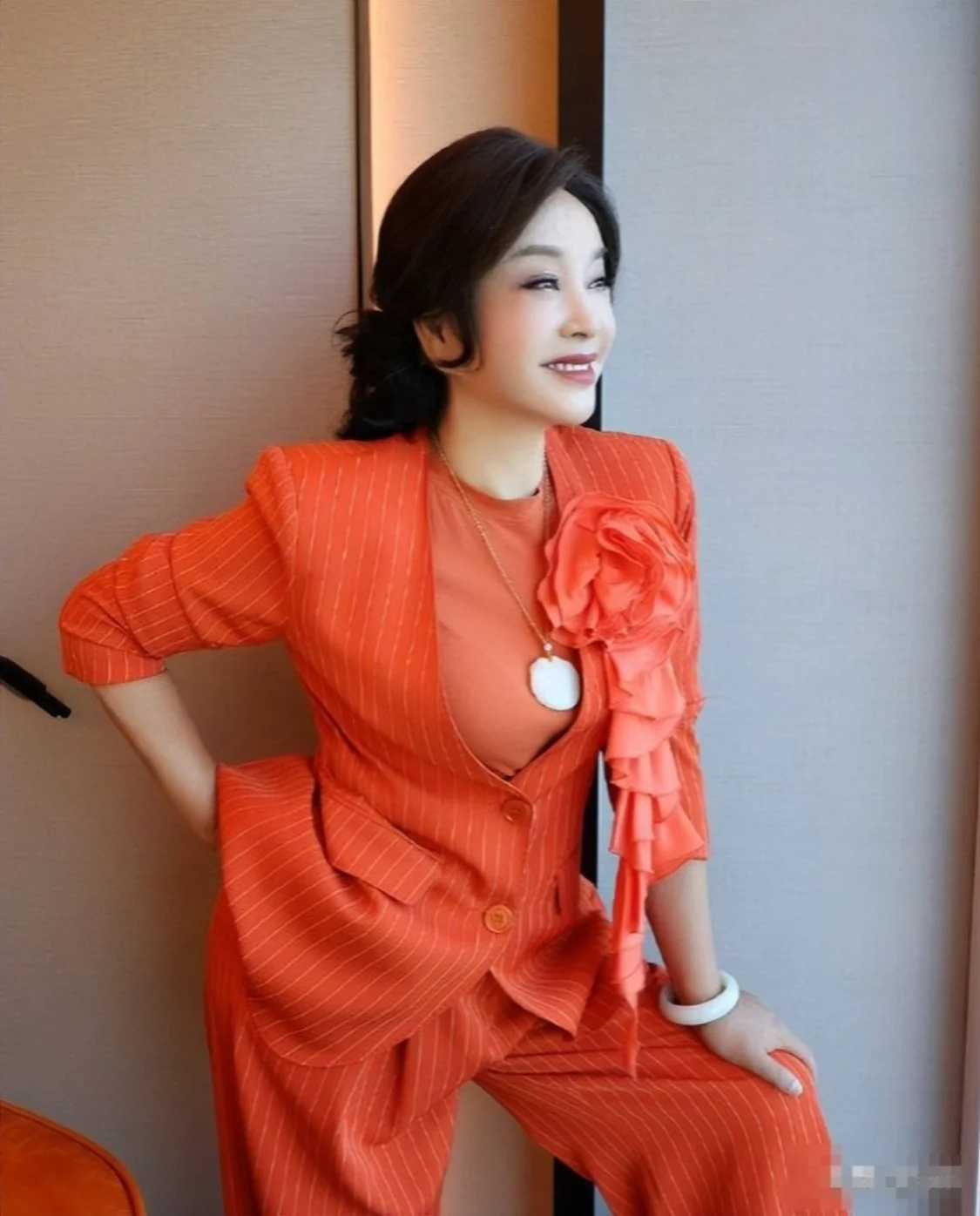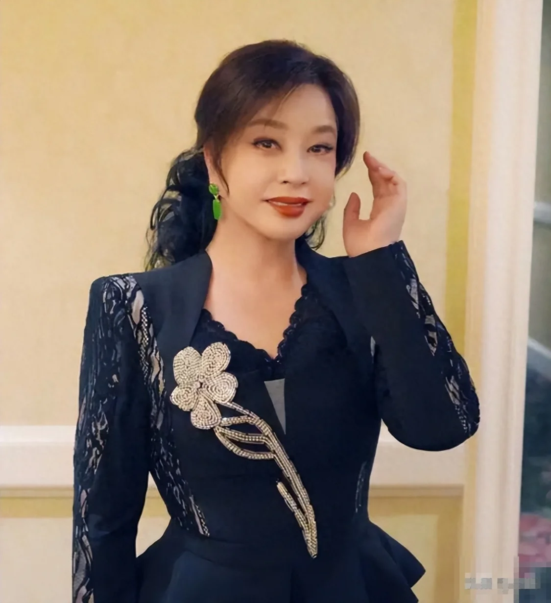 她穿着一身黑色西装,内搭黑色带蕾丝边的内衣,这搭配简直绝了,脖子上还戴着超大颗项链,头发高高盘起,整一个珠光宝气,就像是要去走 T 台似的。虽然有网友说她面部浮肿,有断崖式衰老的迹象,但人家那气场可一点儿没输。