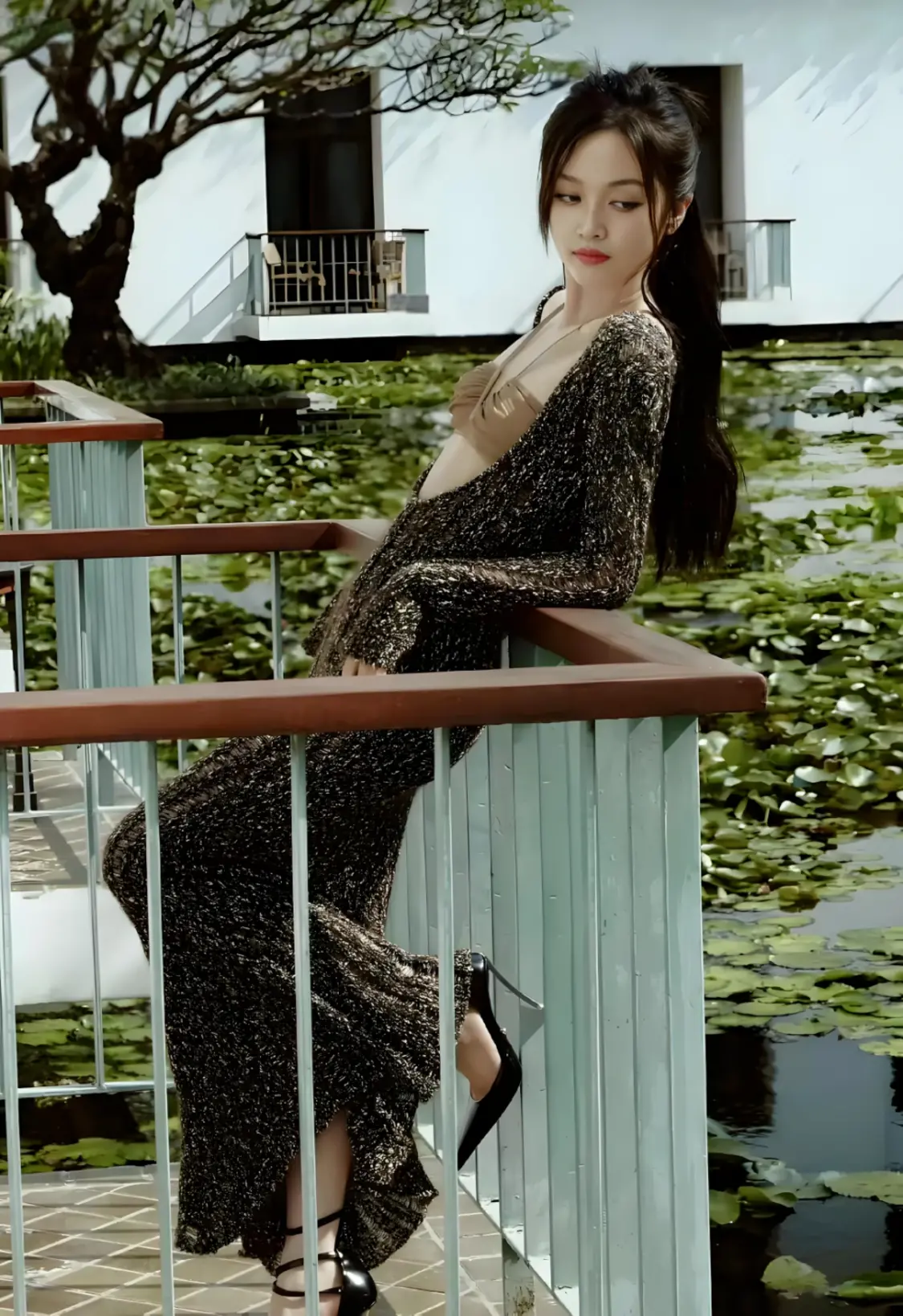 当时,吴宣仪穿着一件深色的深V领礼服,一头长发随意地披散在背后,展现出了玲珑有致的身材。她高挑的身段,精致的锁骨与香肩,以及纤细的腰身全都一览无余。