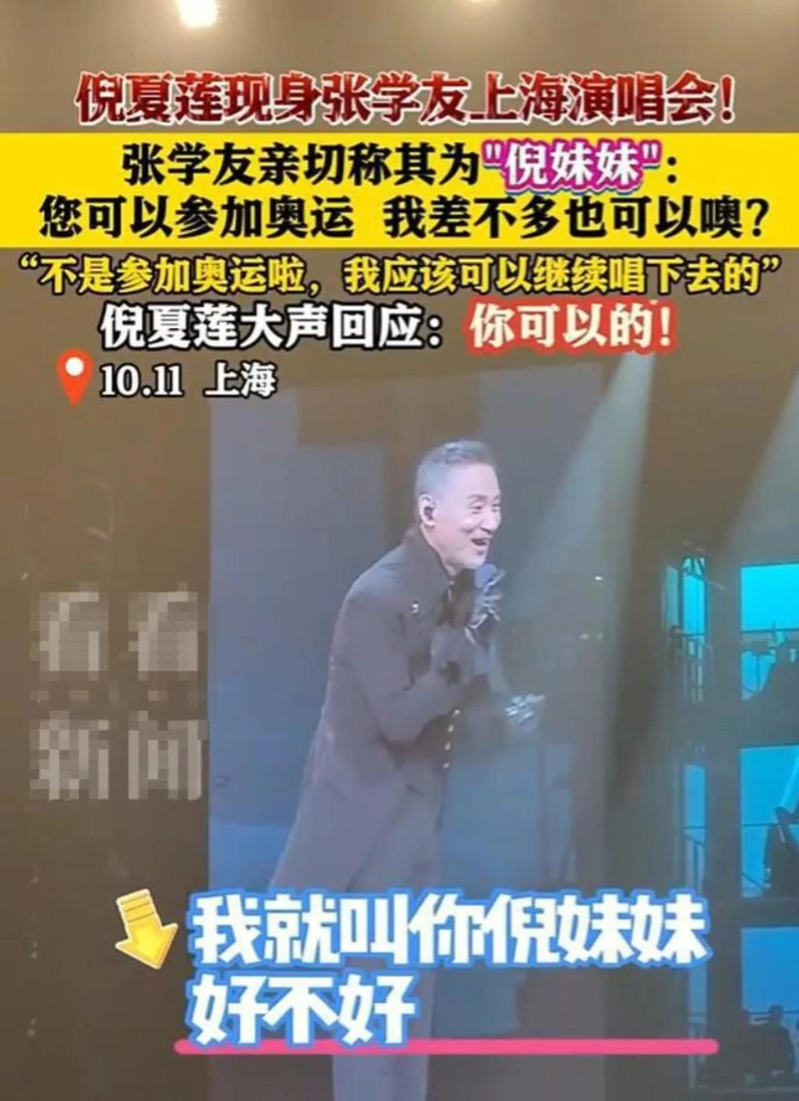 10月11日,倪夏莲现身张学友上海演唱会,张学友亲切称呼其为“倪妹妹”,称受到倪夏莲的鼓舞,“你都可以参加奥运,那我应该也可以继续唱下去的。”倪夏莲回应:“你可以的!”