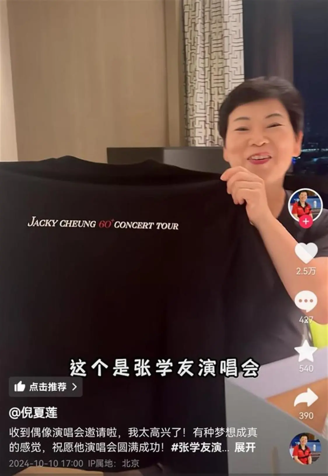 据悉,在10月10日下午,倪夏莲晒收到偶像张学友演唱会邀请:“我太高兴了,有种梦想成真的感觉!”倪夏莲在视频中展示了她收到的礼物,有T恤、张学友60 巡回演唱会-上海站邀请函、演唱会签名海报、签名帽子等。