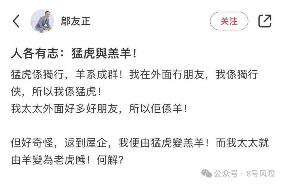 不过,最近邬友正的发言可谓是十分大胆,不仅公开讨论妻子贪财,还暗戳戳回应了三十年前的一段三角恋传闻。