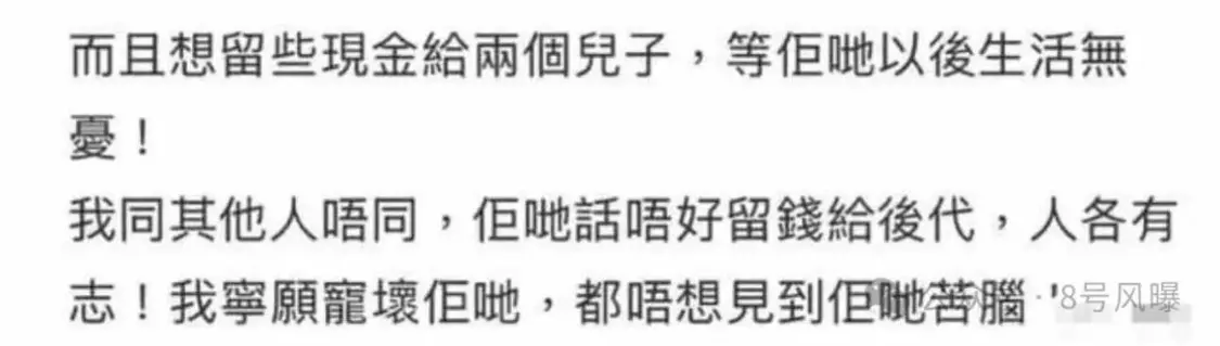 对于两个儿子,邬友正在社交媒体上也透露:会把所有现金留给儿子,让他们衣食无忧。