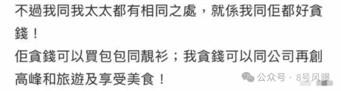 正当网友们议论纷纷时,邬友正又向网友们解释,他爱钱就是希望公司生意再创高峰、能够去周游世界和享受美食。妻子翁嘉穗爱钱,就表现在经常买名牌包包、各种漂亮的衣服。