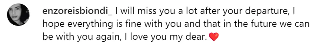 你离开后我会很想念你,希望你一切安好,希望未来我们可以再和你在一起,我爱你,亲爱的。