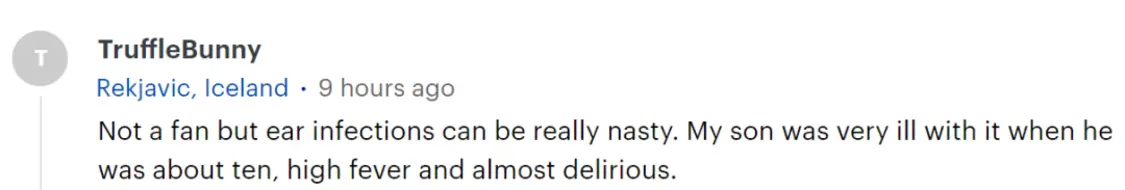不是她的粉丝,但耳部感染真得很讨厌。我的儿子在他10岁那年也感染了,他发高烧几乎神志不清。