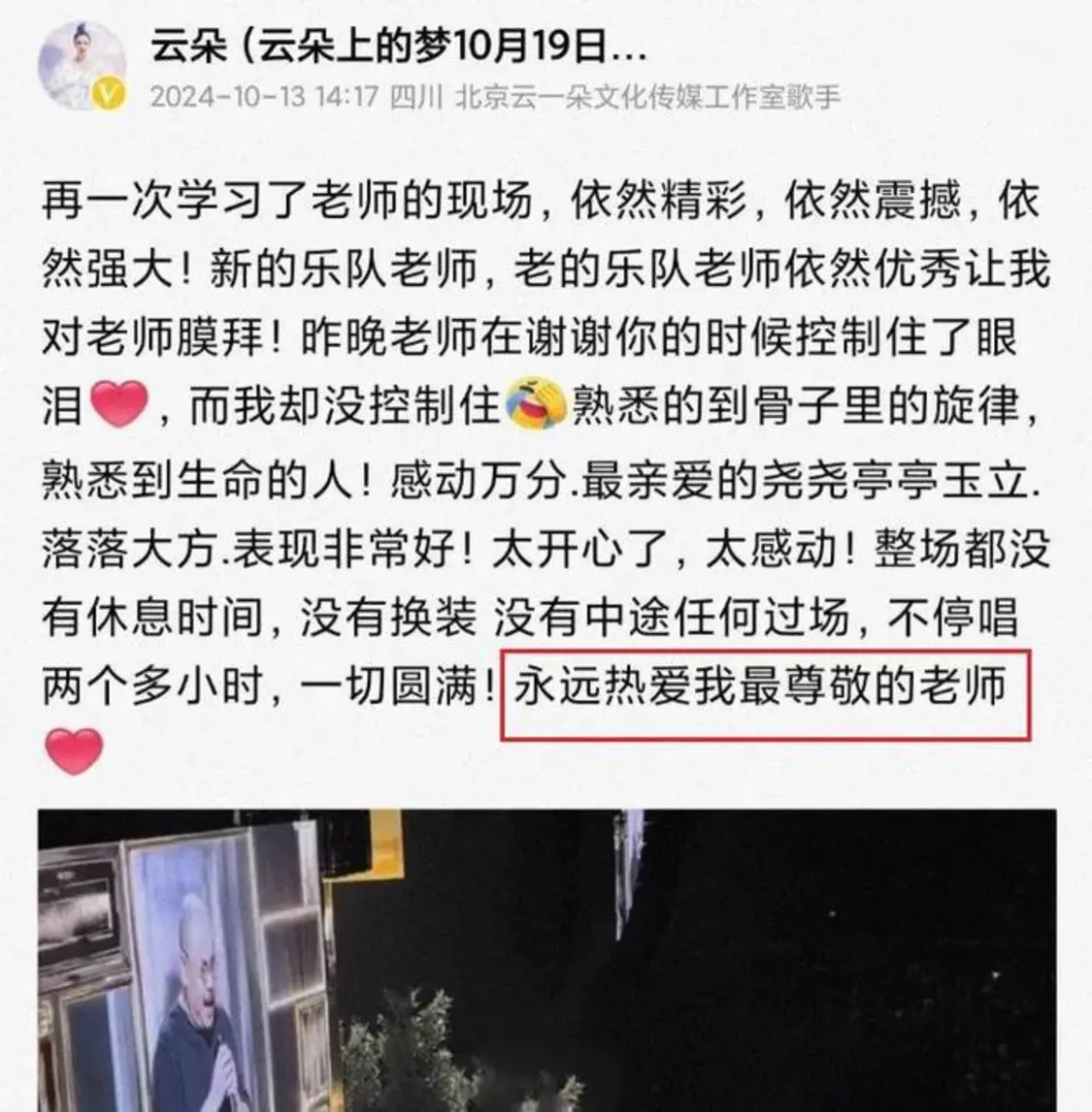 后来虽然云朵现身刀郎演唱会南京站,事后还发文称永远敬重刀郎,甚至在自己的演唱会上还公开喊话,说自己永远是刀郎的徒弟,永远感恩师父师娘。