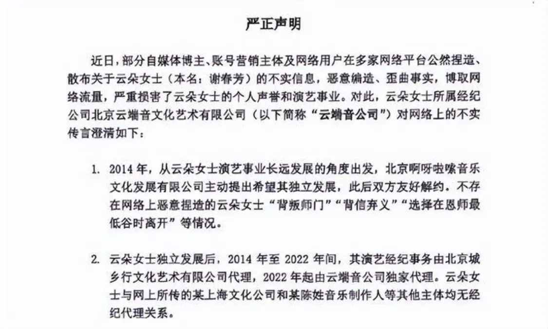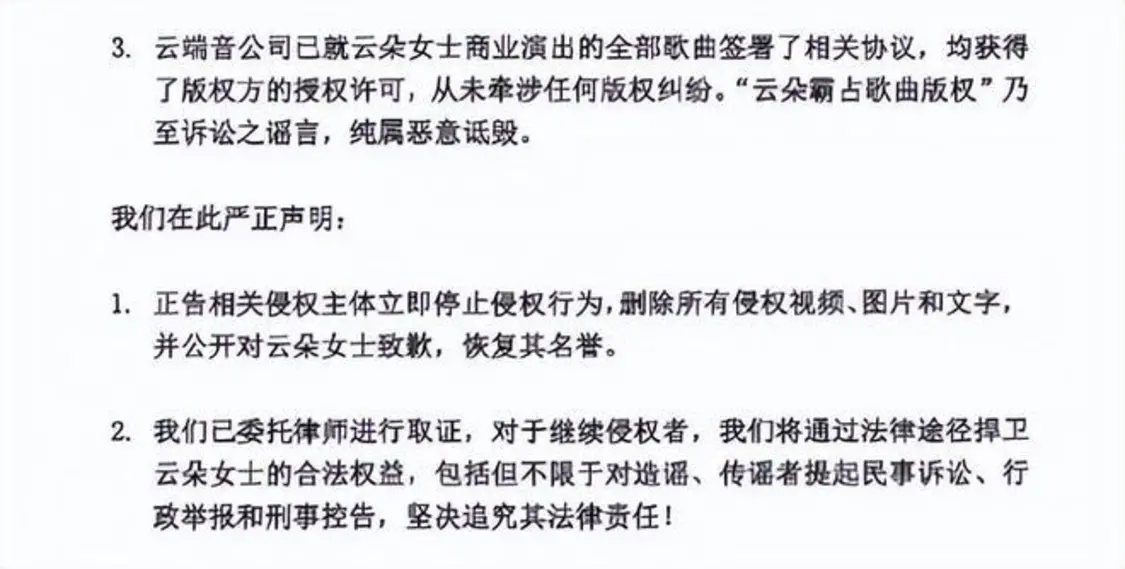 总之,云朵的口碑和形象确实大受影响,也因此影响到了她的事业,于是云朵公司“云端音”发布了声明,给云朵正名。