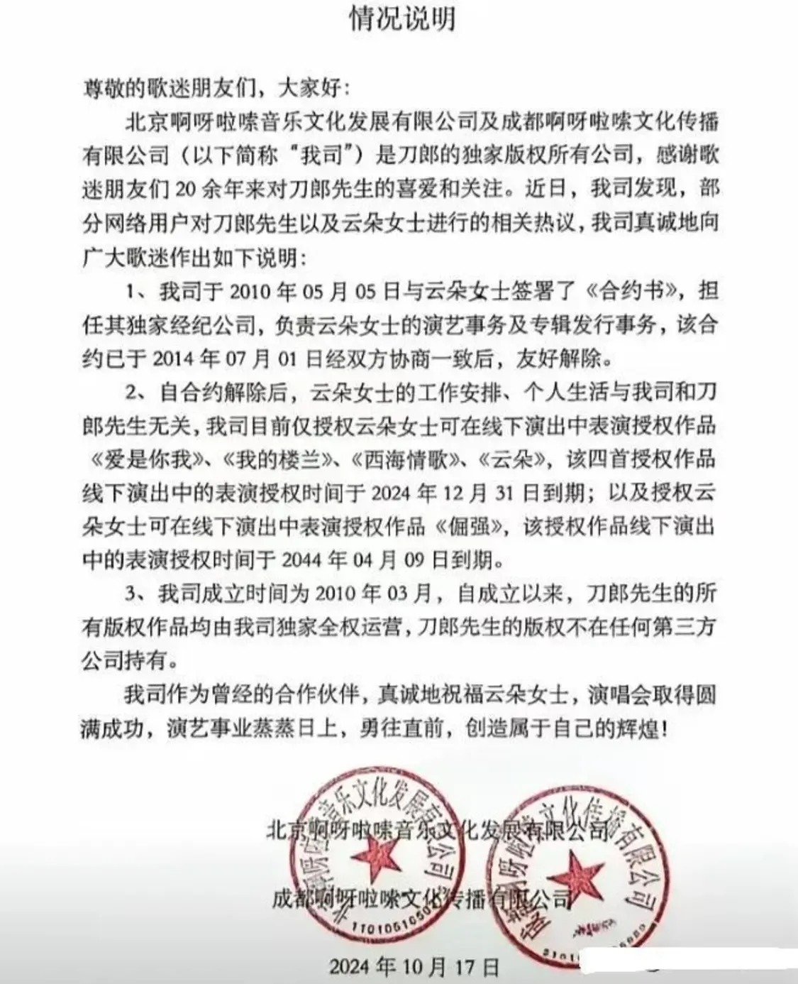紧接着,刀郎版权公司还曾发布声明,强调与云朵早已解约10年。而2014年的刀郎正处在低谷期,这也让不少网友质疑云朵忘恩负义,在师父低谷期选择离开。