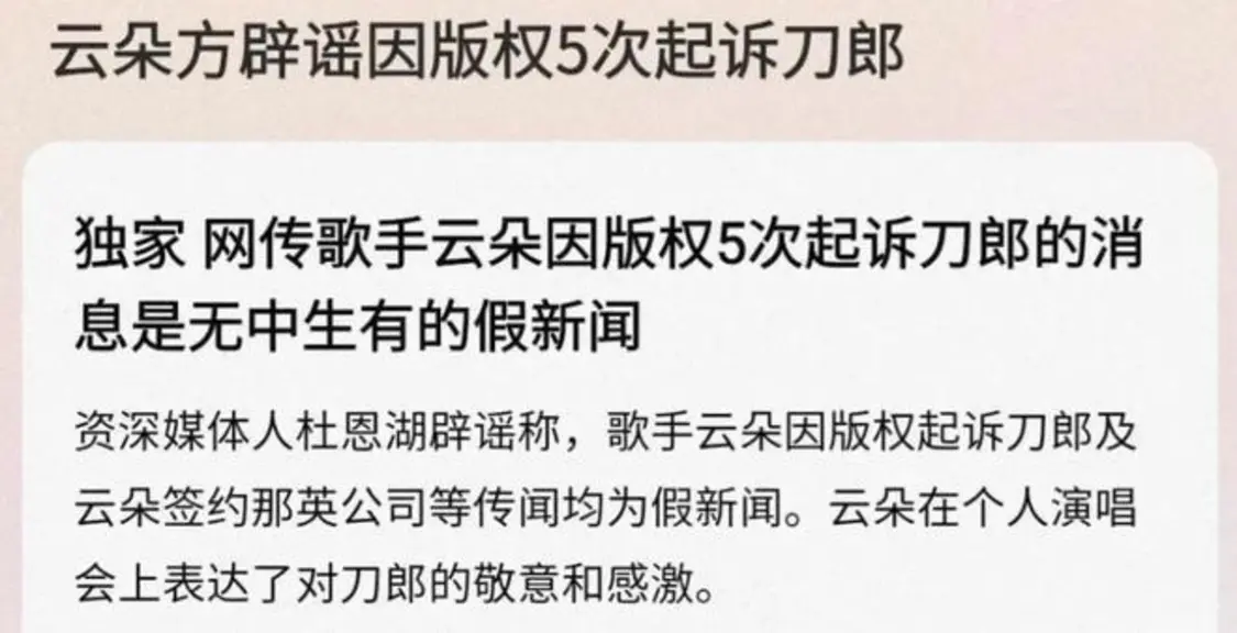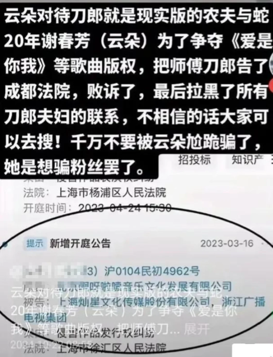 舆论持续发酵,在传出云朵背叛刀郎,转投那英的传言的同时,又有网友爆料称云朵曾为了霸占刀郎为其创作的《爱是你我》《我的楼兰》等歌曲的版权,先后5次起诉刀郎。