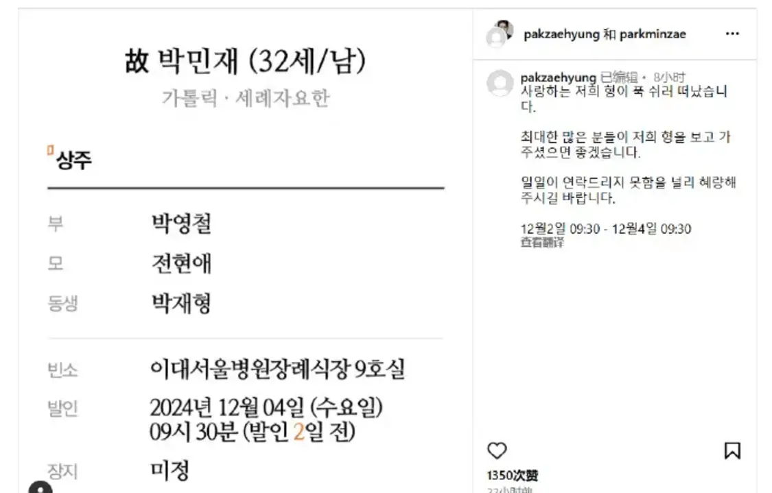 据韩媒报道,韩国演员朴敏宰于11月29日在中国旅行期间,因心脏骤停去世,年仅32岁。弟弟在朴敏宰的社交账号上发文证实:“亲爱的哥哥去好好休息了,希望大家能来送他最后一程。”
