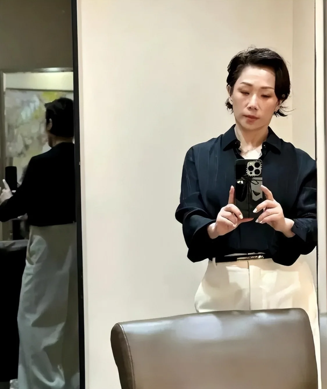 虽然自己的身材不及年轻时候好看,可自身的气质却非常的在线,这和同龄人相比已经非常不错了。