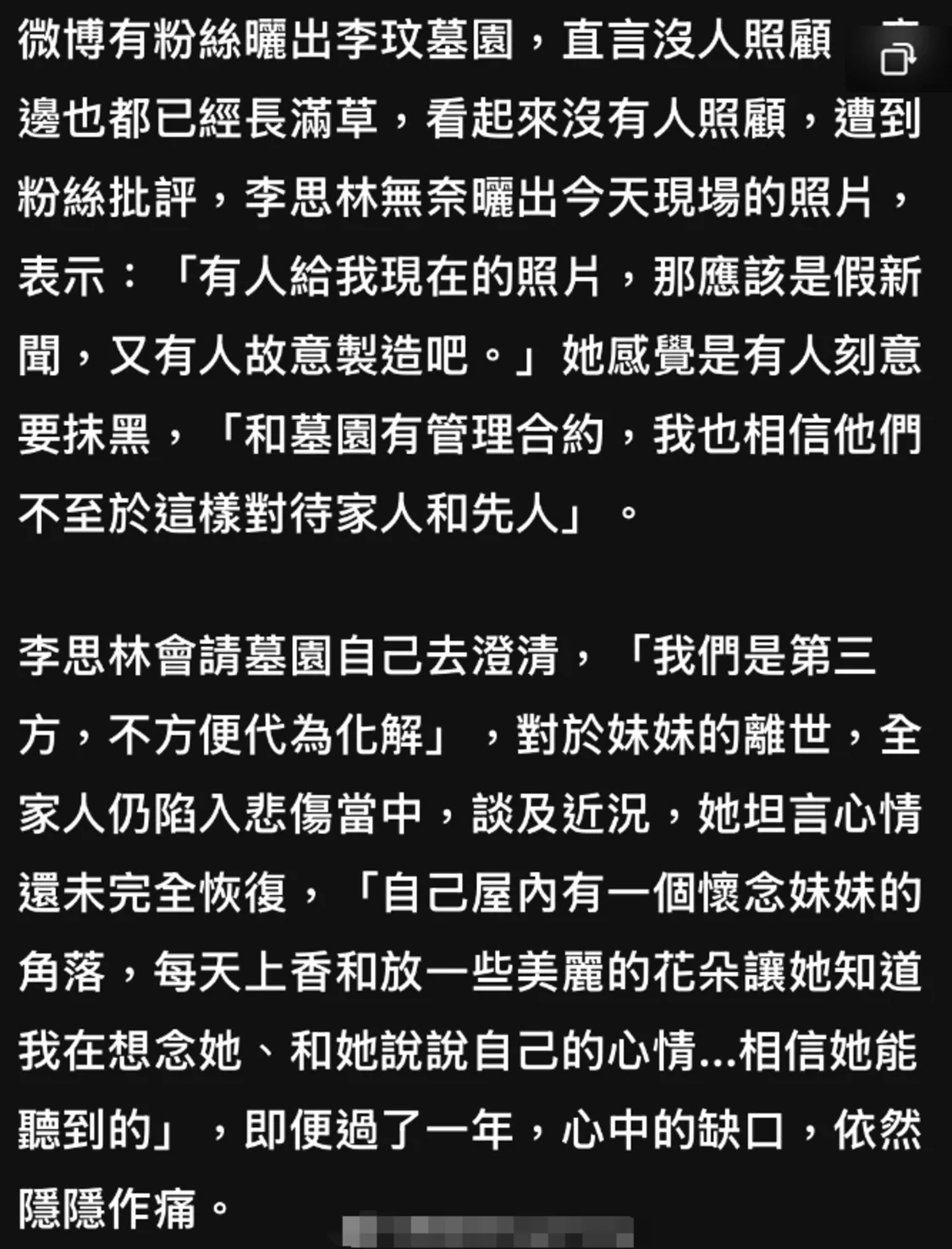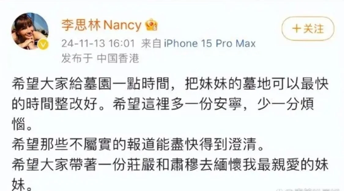 针对网上的言论,李玟的二姐李思林在11月13日接受了港媒的采访,她表示对李玟墓地的改造工程知情,称这是石门峰墓园的安排,作为家人只能附和。