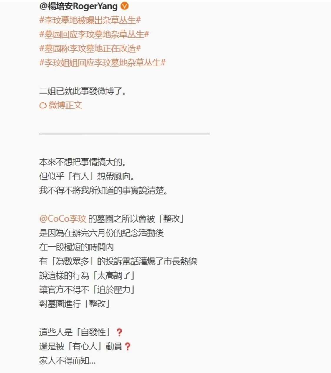 杨培安在文中表示,李玟的墓园之所以会被“整改”,是因为六月份办完纪念活动之后,在一段极短的时间内,有很多人别有用心的人打电话投诉,说这样的行为太高调,官方迫于舆论压力才不得不对墓园进行整改。