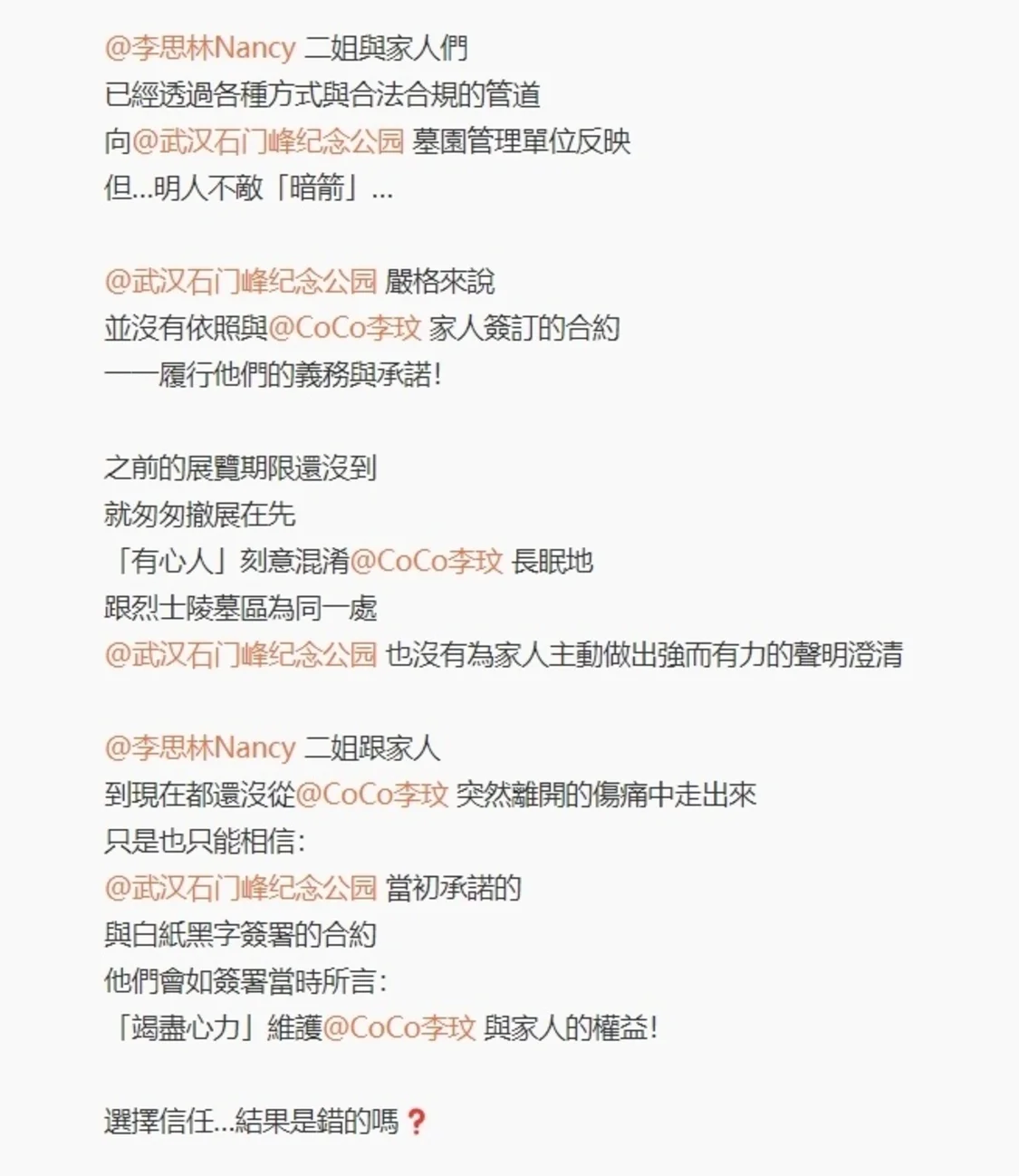 李玟的墓地合法合规,二姐李思林通过各种方式向墓园反映,可明人不敌暗箭,再加上别有用心的人一直在散布舆论,混淆李玟的墓地与烈士陵园在一起,墓园方面也没有及时发布有力声明澄清。