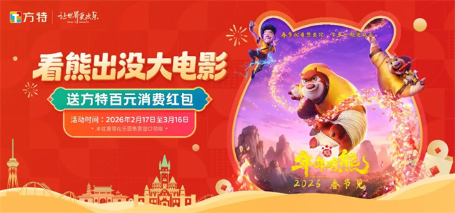 游客在方特主题乐园售票窗口出示《熊出没年年有熊》电影纸质票根和购票记录(包括但不限于电子订单或者付款记录),工作人员回收票根后,游客现场扫码领取组合红包,一个手机号限领取1次。